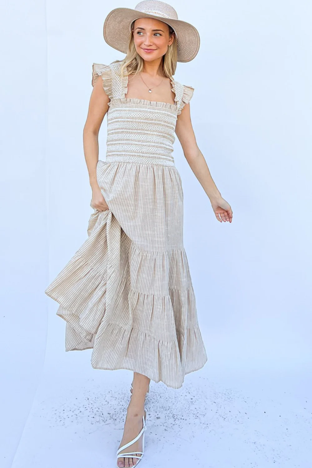 Set of 2 Beige Dining Chairs | Channel Upholstered Accent Chairs with Solid Wood Legs