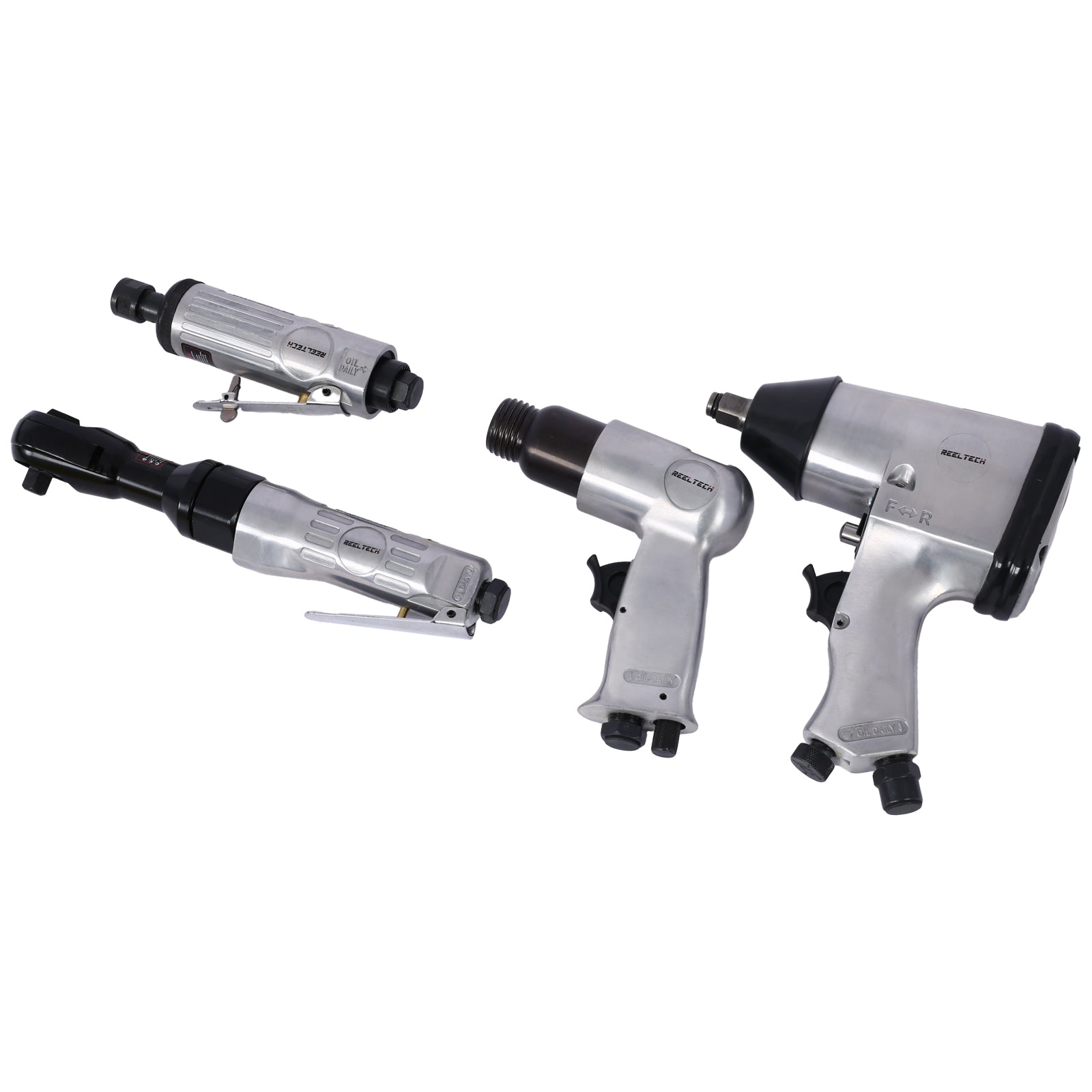 Complete Air Tool Set: Includes a 1/2" impact wrench, 3/8" air ratchet, 1/4" die grinder, and air hammer.