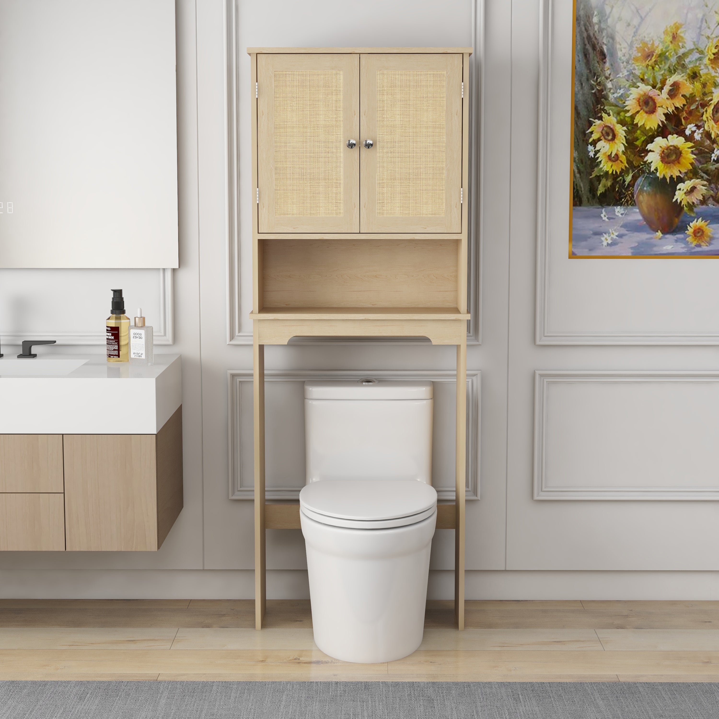 Over The Toilet Storage Cabinet, Bathroom Shelves Over Toilet with 2 Rattan Doors&Adjustable Shelves&Open Storage Shelf-Natural Wood