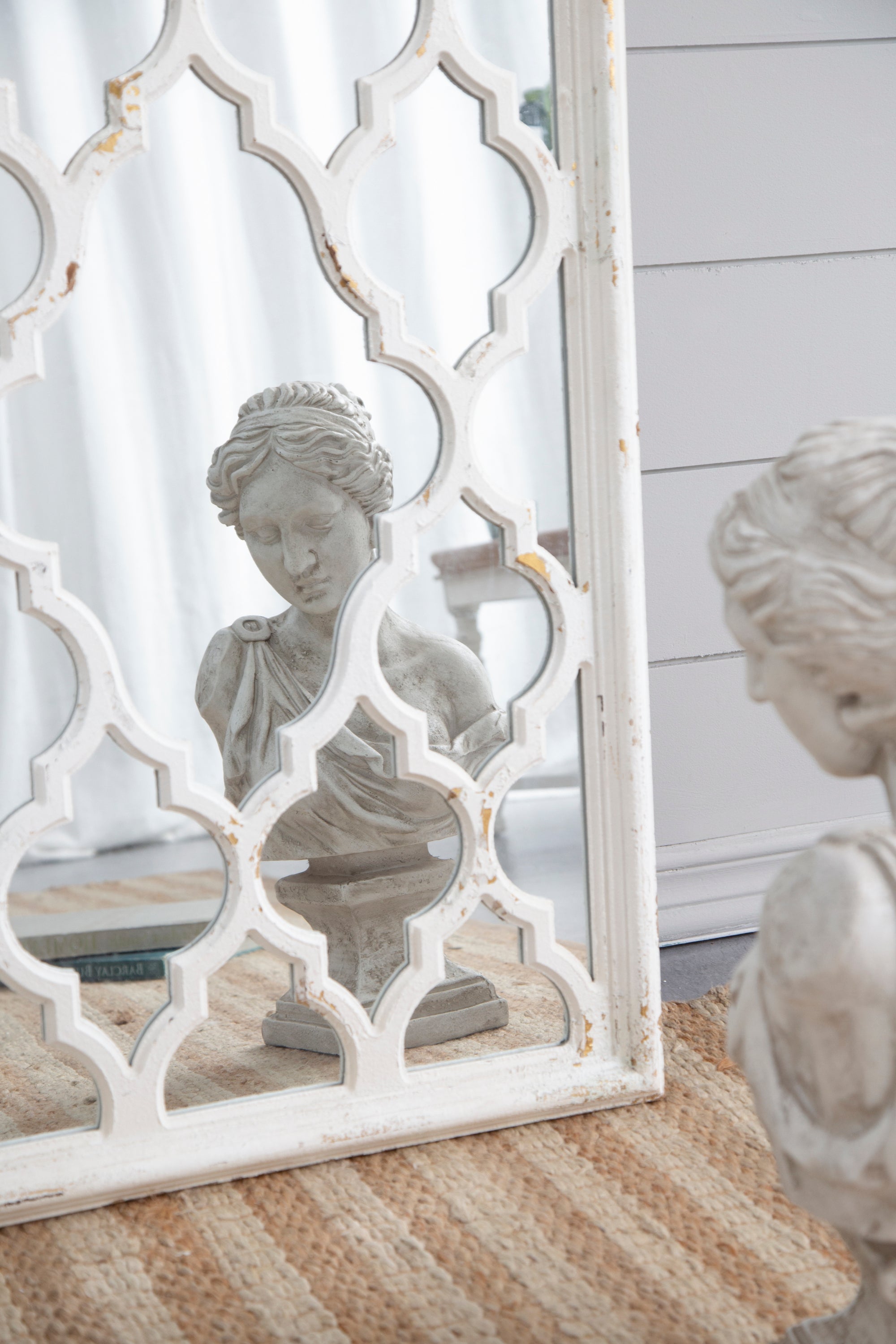 Pairing a classic pattern and a distressed white finish,this gorgeous mirror brings an elegant,slightly vintage touch to any room.This lovely mirror fits perfectly in a luxurious master bathroom,airy sunroom,or sweeping foyer.With its tall 59″ height,this mirror offers a full-length look with classic,graceful style that complements virtually any style of home.