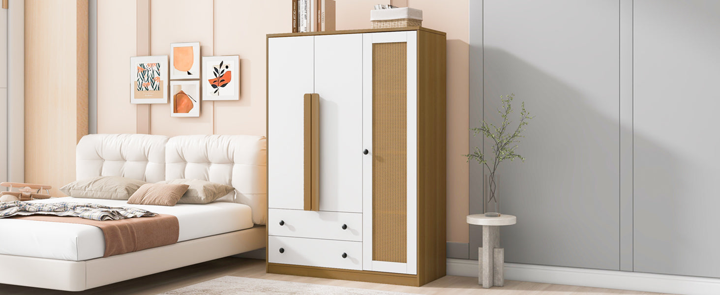 3-Doors Wooden Rattan Wardrobe Storage for Bedroom,with 2 Drawers,White+Nature