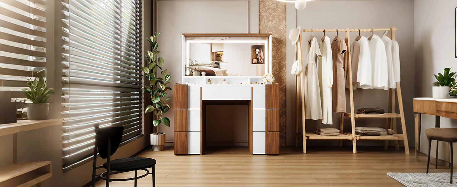Upgrade your beauty routine with this 44.4" Elegant Vanity Table, designed to bring both style and functionality to your bedroom or dressing area. Featuring a large lighted mirror with built-in LED lights and a convenient power outlet, this modern vanity makes it easy to perfect your look while keeping your devices charged.