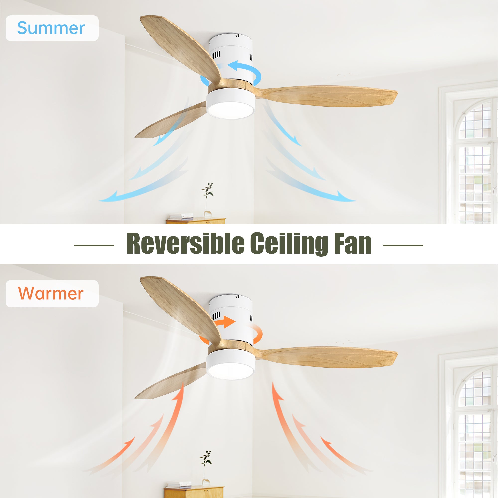 - Reversible Ceiling Fan: Copper DC motor provides strong air flow and quiet operation. With the reversible function, you can change the direction from downdraft mode during the summer to updraft mode during the winter