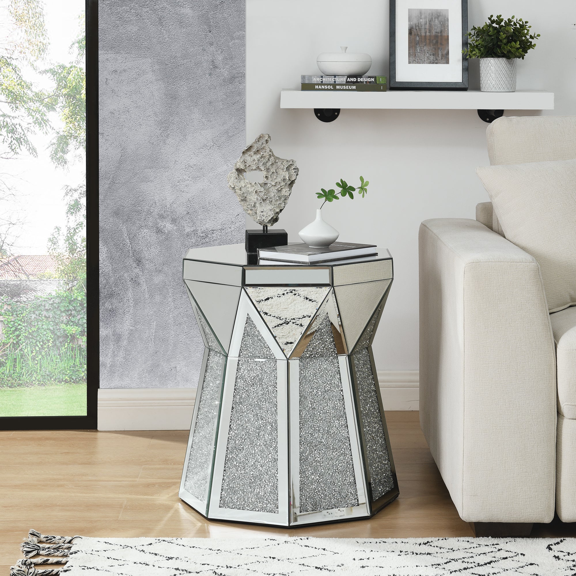 - Art Deco Mirror Table - A fusion of glam and practicality, This livingroom mirrored accent table with crushed diamonds framing and the simple silver all mirrordesign that can be placed beside livingroom sofa, add glamorous elegant glows and glitterings to the room