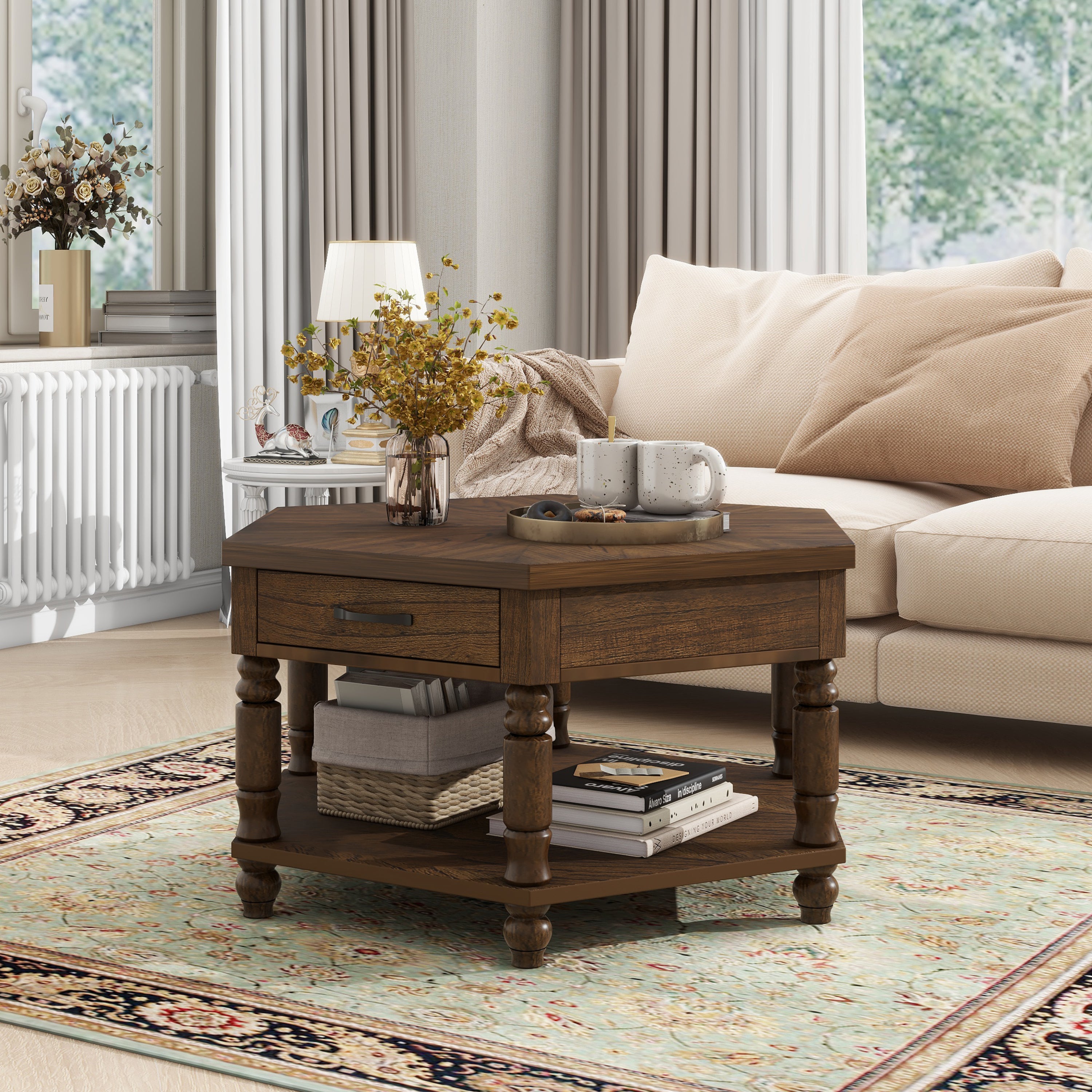 - 【Hexagonal Coffee Table with Drawers and Storage Shelf】- The hexagonal coffee table combines style with functionality by featuring a drawer and a lower storage shelf. The drawer provides a hidden storage space for small items like remote controls or coasters, while the shelf offers additional room for books, magazines, or decorative pieces. Keep your living room organized and clutter-free with this versatile and practical coffee table.