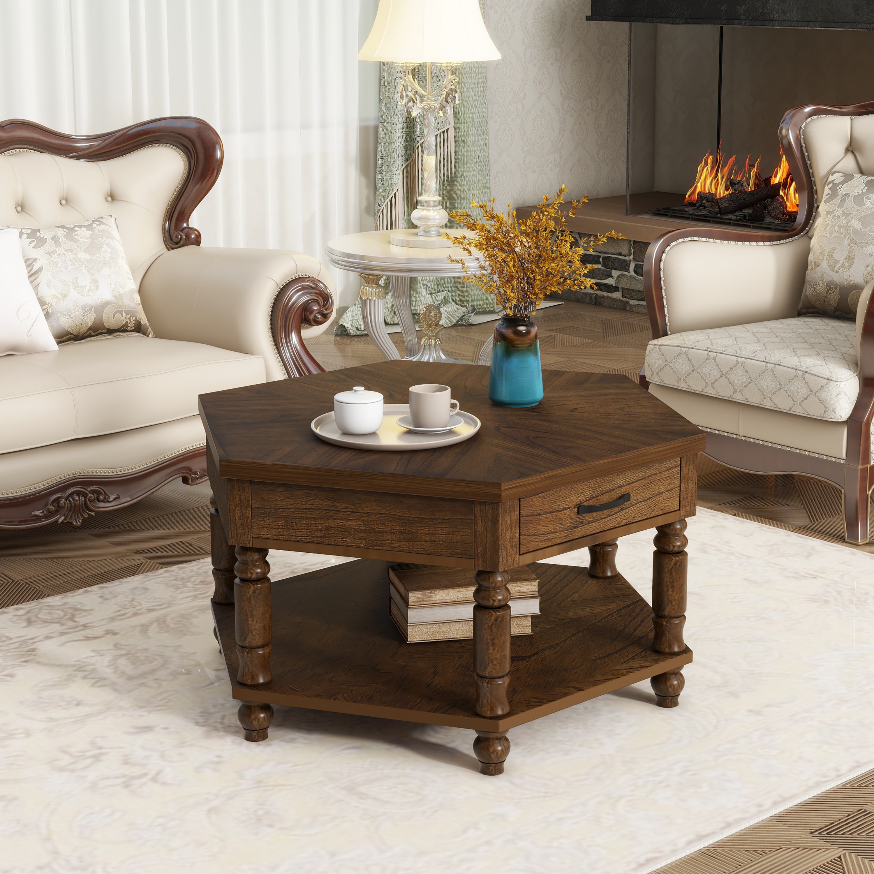 - 【Spacious Storage】 - The hexagonal table top is 36", which provides spacious space for living room supplies and keeps your daily essentials nearby. Two storage drawers and shelves give you extra space to store magazines and toys and make your home tidy and clean.