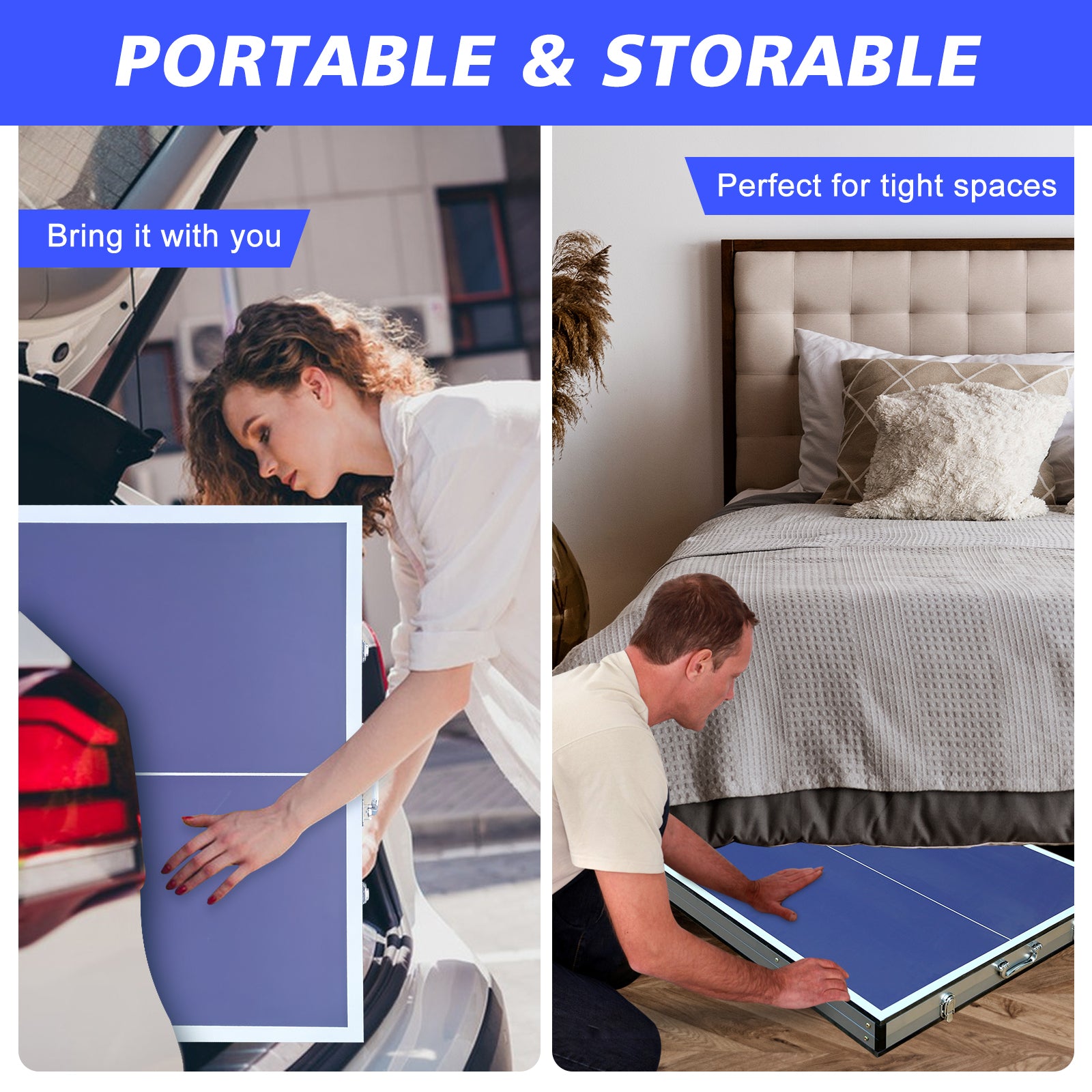 Product Description: Enjoy endless fun with our 5ft mid-size table tennis table! Perfect for indoor games, this foldable and portable ping pong table set includes a net, 2 paddles, and 3 balls. Its compact design makes it ideal for smaller spaces, offering great entertainment for families and friends.
