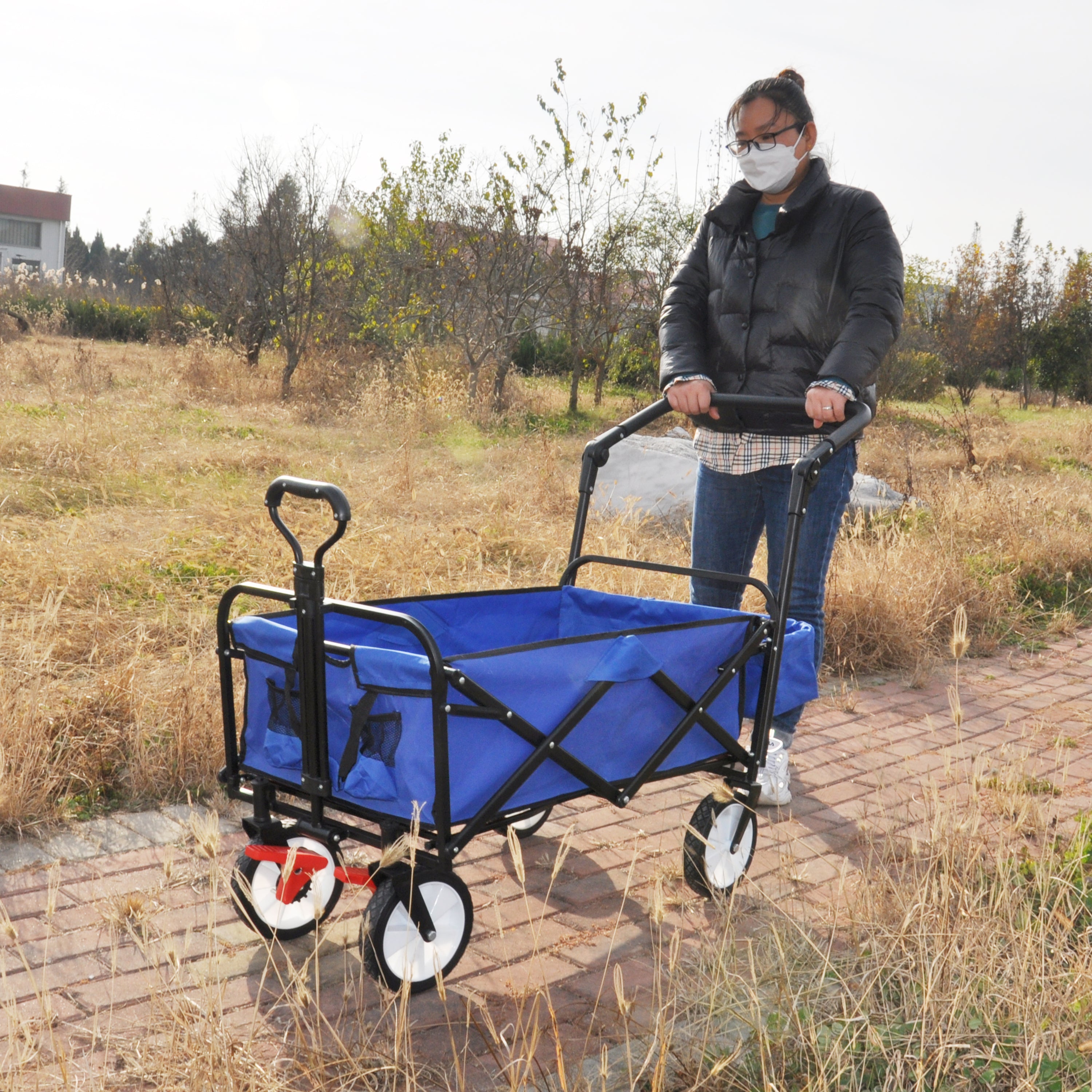 - Folding carts are strong and durable. Equipped with a steel frame and 600D PVC fabric, it can support up to 150 pounds. It can pull -- the front wheels can rotate 360 degrees. It allows you to navigate around obstacles with ease. Solid structure, asphalt pavement, cement pavement, soil pavement and grass pavement adapted to the terrain. With front wheel emergency brake, it is safer.