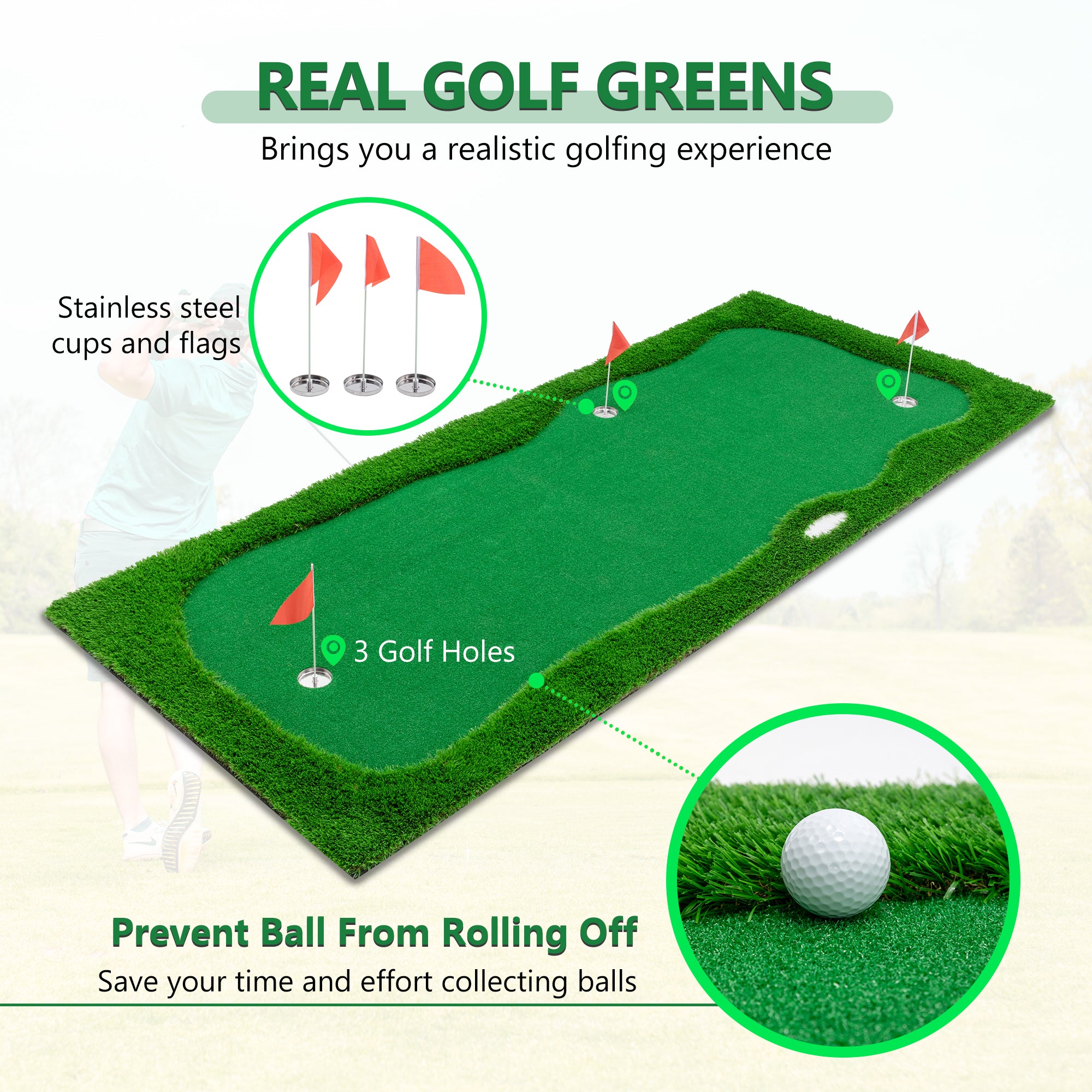 With three practice holes, three flags, and cups included, this putting mat offers a realistic and engaging training experience for golfers of all levels. Whether you're setting it up in your backyard, basement, office, or garage, this putting green is ideal for year-round practice.
