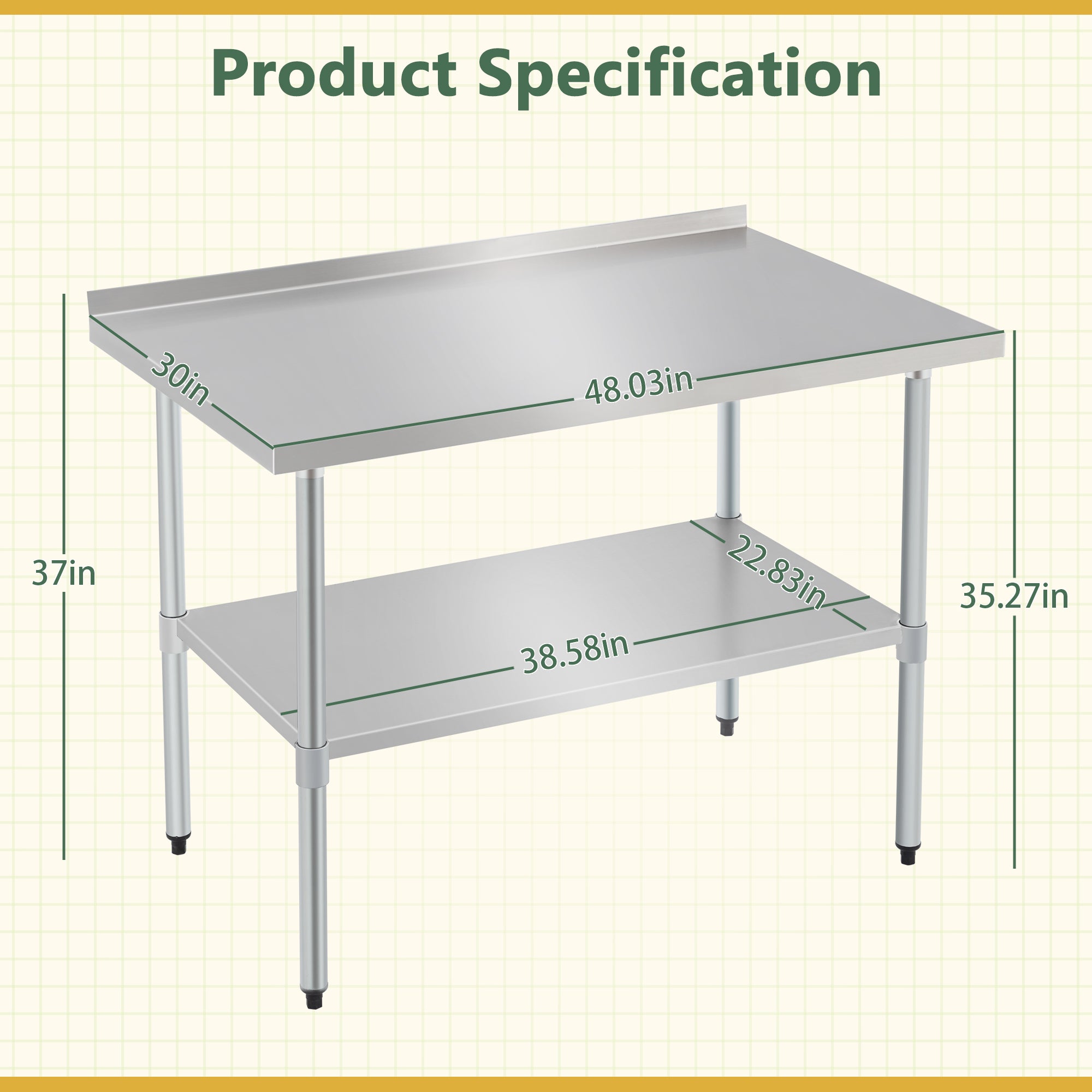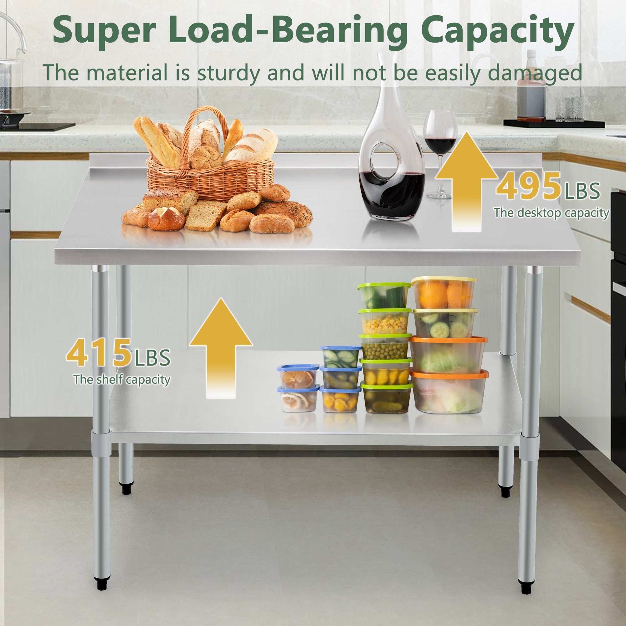 - 【High Weight Capacity for Versatile Use】Measuring 30” x 48” x 37”), this stainless steel table boasts a robust top shelf with a weight capacity of up to 560 lbs (or specify if different), and an undershelf capable of holding up to 460 lbs. Whether you're prepping food, storing equipment, or using it as a workbench, this table can handle the demands of any commercial or residential setting.
