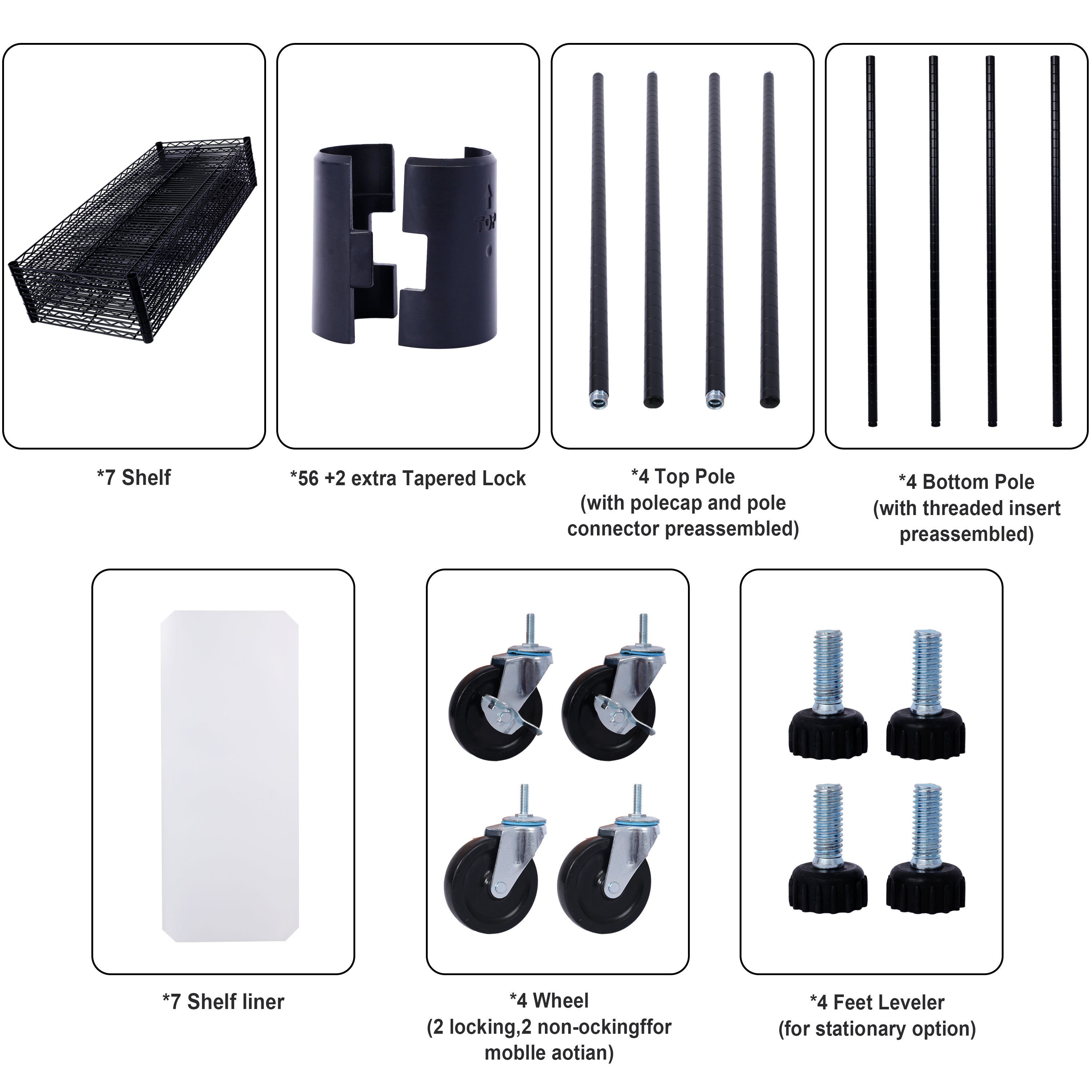 - Effortless Mobility: Our 7-tier garage shelves are equipped with 4 leveling feet and 4 industrial wheels (2 lockable), facilitating easy positioning in supermarkets, garages, closets, kitchens, porches, pantries, and more. The height-adjustable leveling feet ensure stability even on uneven ground, and the non-slip design prevents floor scratching.