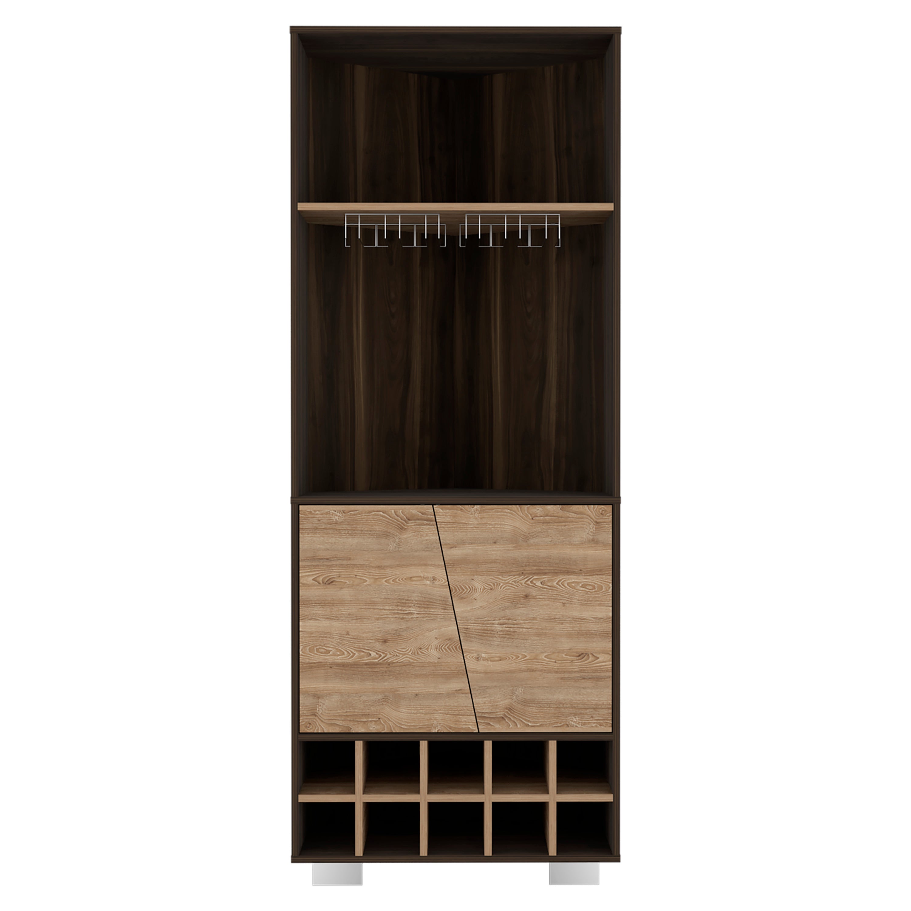 Fraktal Corner Bar Cabinet, Ten Built-in Wine Rack, Two Shelves, Double Door Dark Oak / Pine