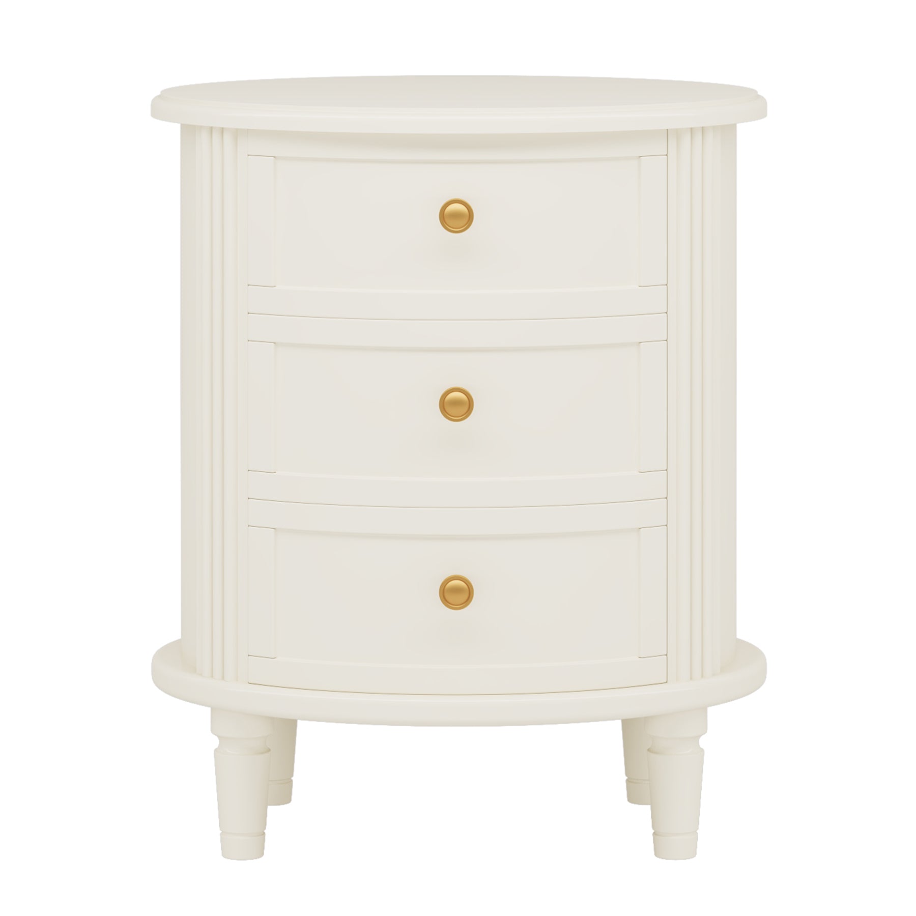 Product Description: Upgrade your space with this stunning 20" Oval Nightstand, the perfect blend of farmhouse charm and modern elegance. Arriving fully assembled (just attach the solid wood legs!), this 3-drawer bedside table saves you time and effort. Its unique oval silhouette and soft, hand-painted beige-white finish effortlessly complement any decor, from rustic to contemporary. Three spacious drawers with elegant metal pulls provide generous storage for all your essentials, while the sturdy tabletop is perfect for a lamp or decor. Use it as a stylish bedroom nightstand or a functional wood side end table in your living room.