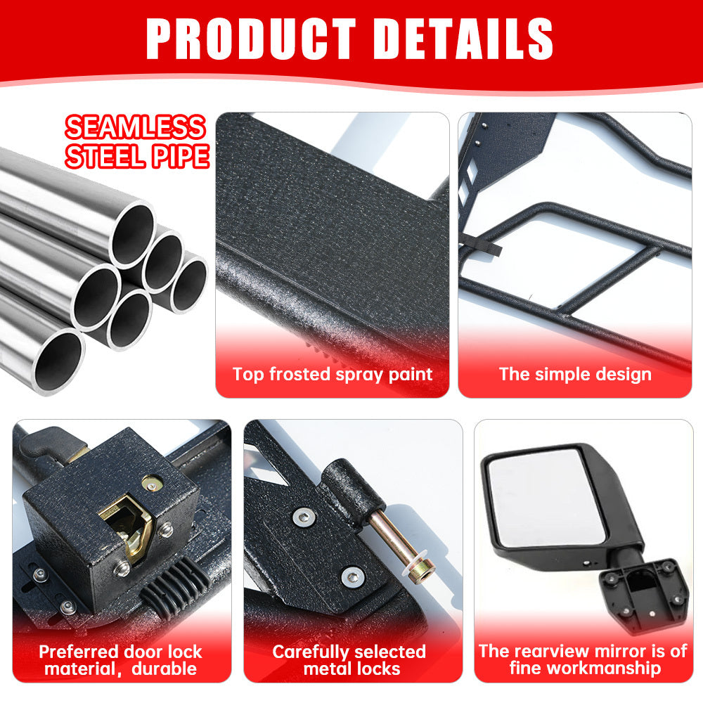 • Compatibility: The Steel Tube Half Doors with Side View Mirror for 2018-2024 Jeep Wrangler JL JLU & Gladiator JT 4-Doors(Includes 4XE). They will not fit a Jeep Wrangler JK model.