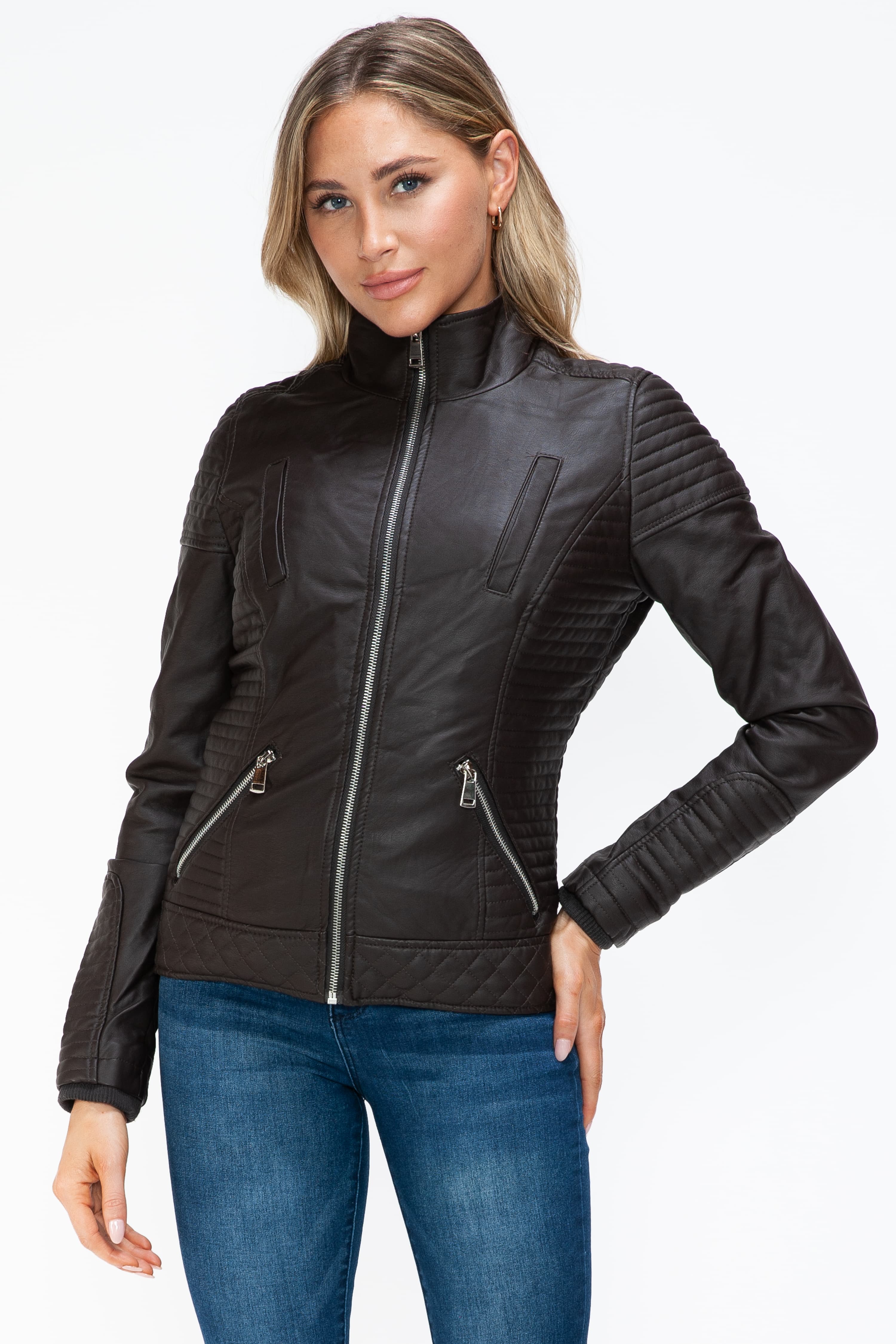 YMI Faux Layered Double-Zipper Jacket with Fuzzy Hood
