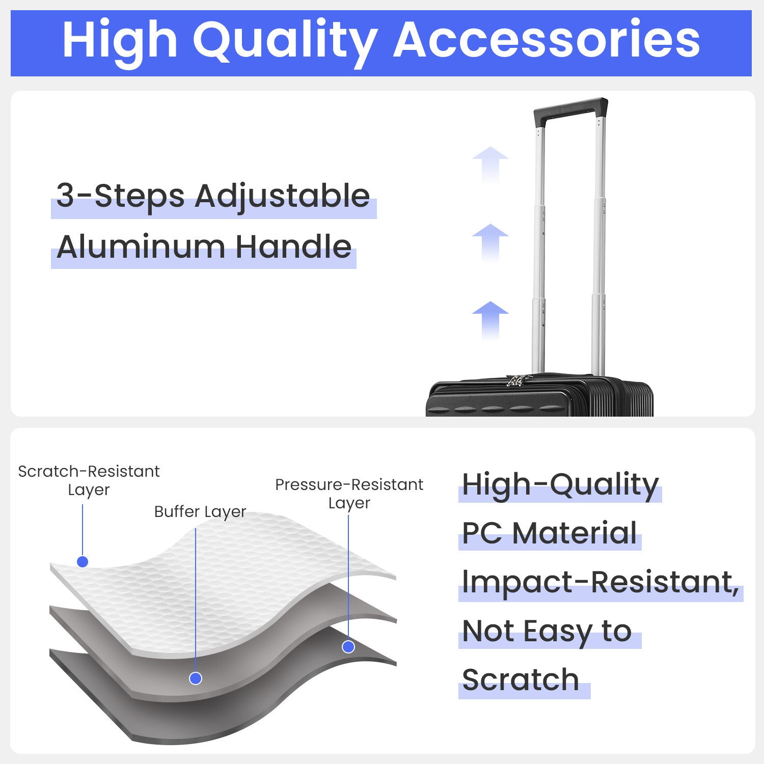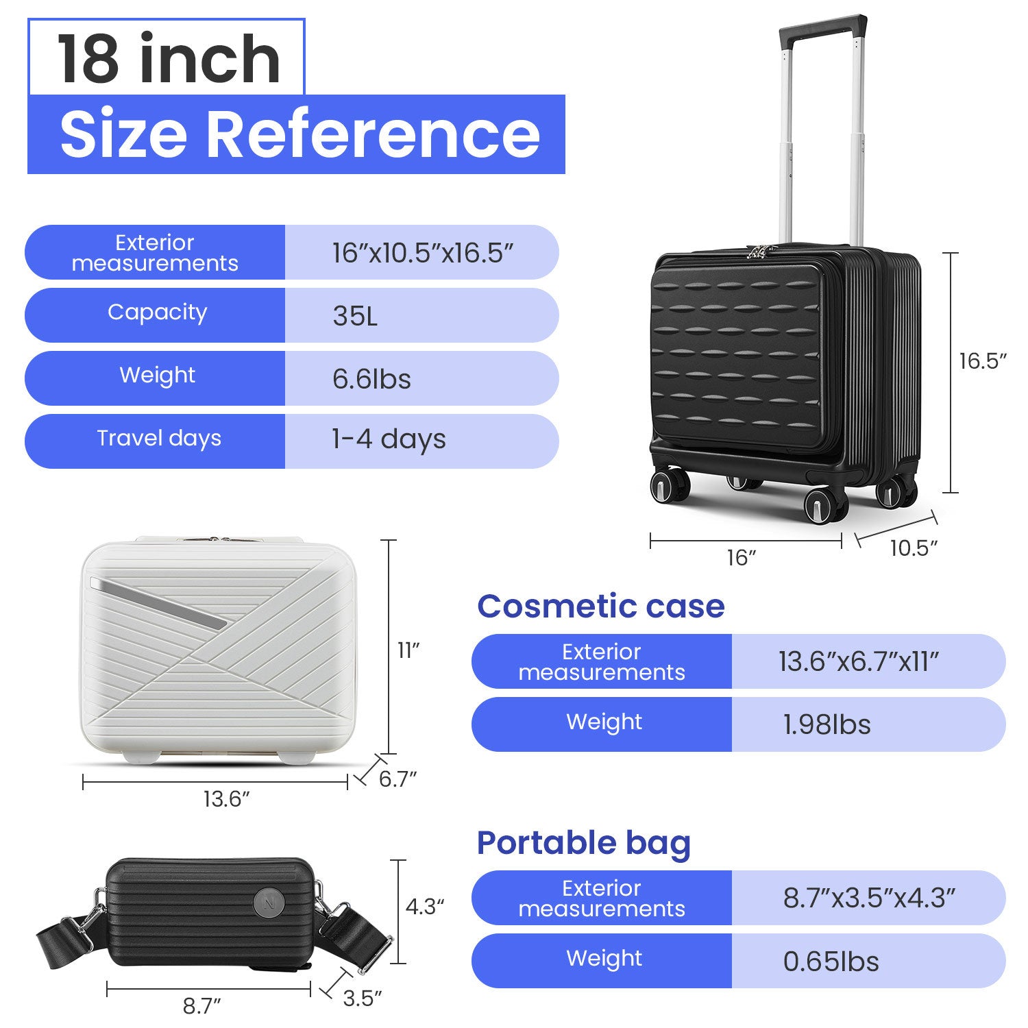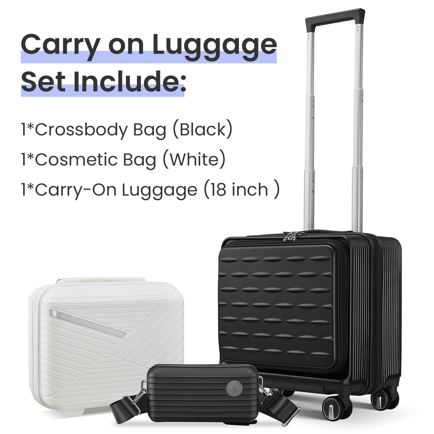 • 【Packaging】】Carry on Luggage Set include: 1*Crossbody Bag (Black), 1*Cosmetic Bag(White), 1*Carry-on Luggage (18 inch )