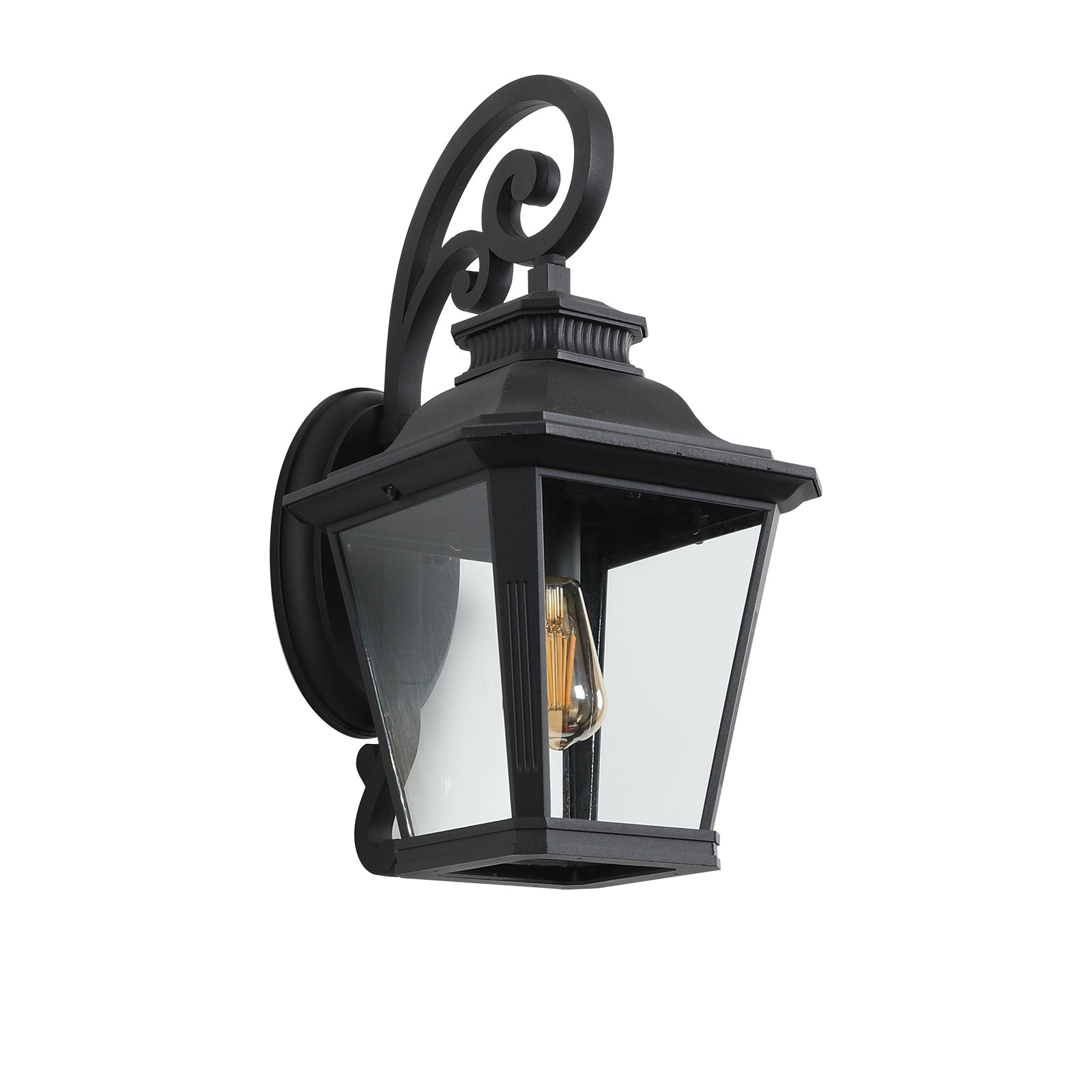 Product Description: Enhance your home's curb appeal with this 21-inch vintage outdoor wall lantern. Featuring a black metal frame and clear glass panels with a decorative scroll design, this sconce is perfect for illuminating your porch, patio, or garden. Adds a classic touch to any exterior. (Bulb not included).