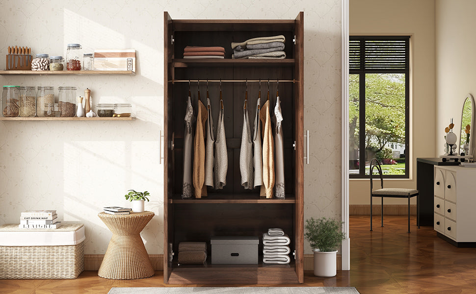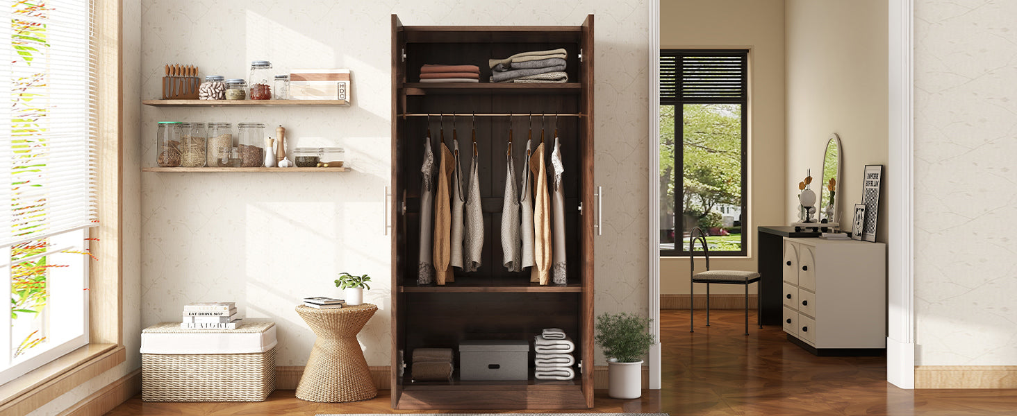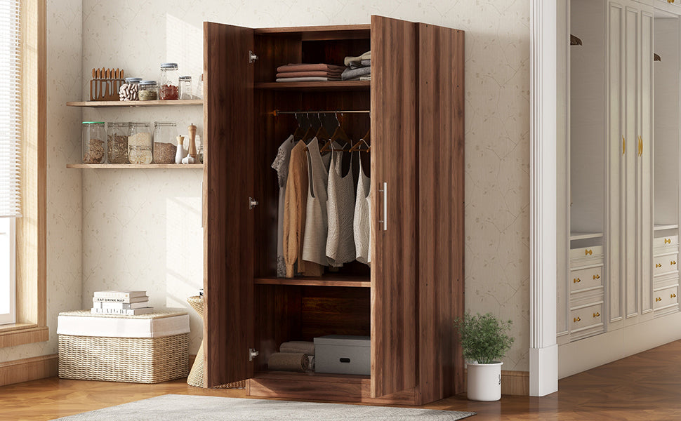 2-Door Wooden Wardrobe Armoire with 3 Storage Shelves, Brown