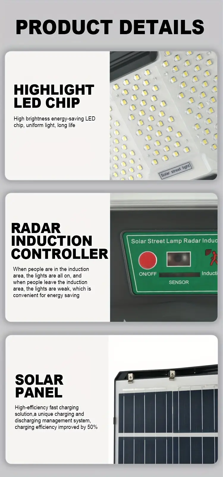 - SMART LIGHT CONTROL ON :No need to operate for all weather changes.Daytime automatic charging,Automatically turns on at night