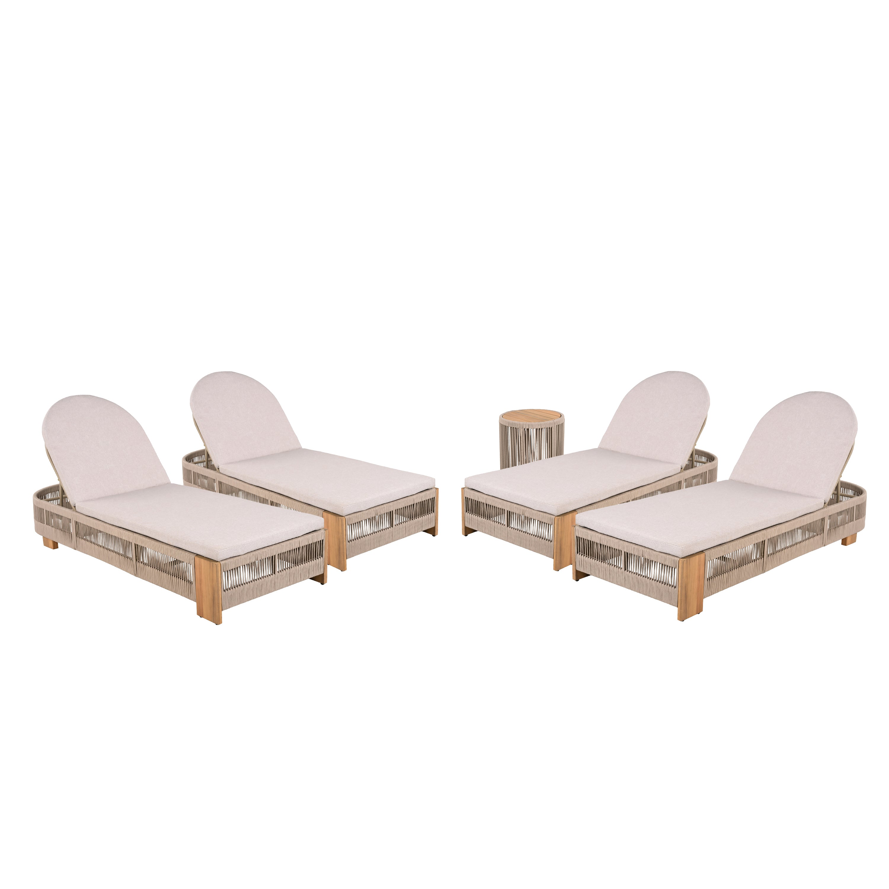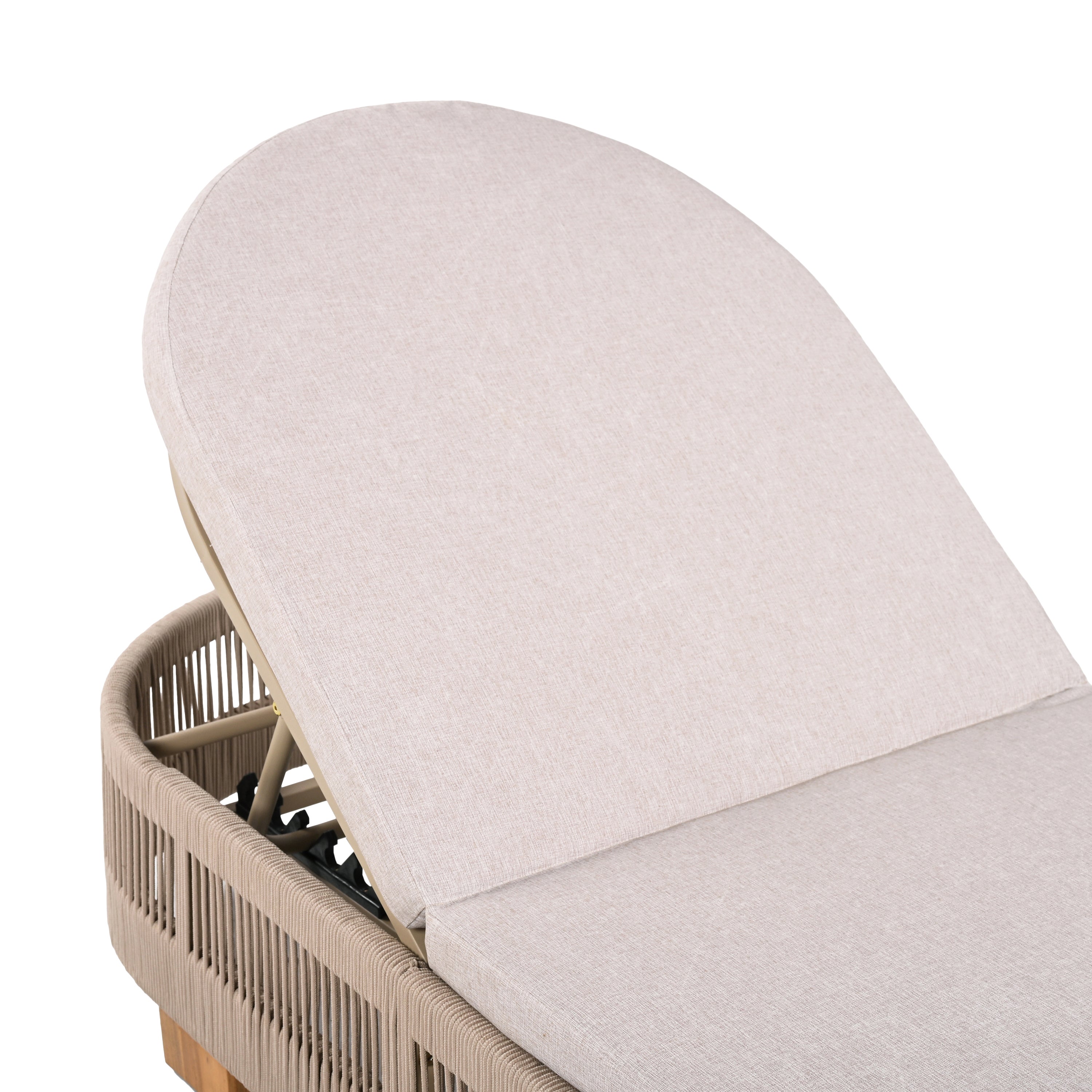 Transform your outdoor space into a luxurious retreat with this 3-piece Outdoor Rope Chaise Lounge Set. Designed for comfort and style, the set includes two chaise lounges and a matching side table, all featuring a modern beige rope design complemented by teak-look acacia wood accents. Each lounge chair offers an adjustable backrest, allowing you to find the perfect reclining position for relaxation. The accompanying side table provides convenient space for drinks, books, or snacks. With plush beige cushions included, this set is perfect for poolside lounging, garden relaxation, or patio gatherings.