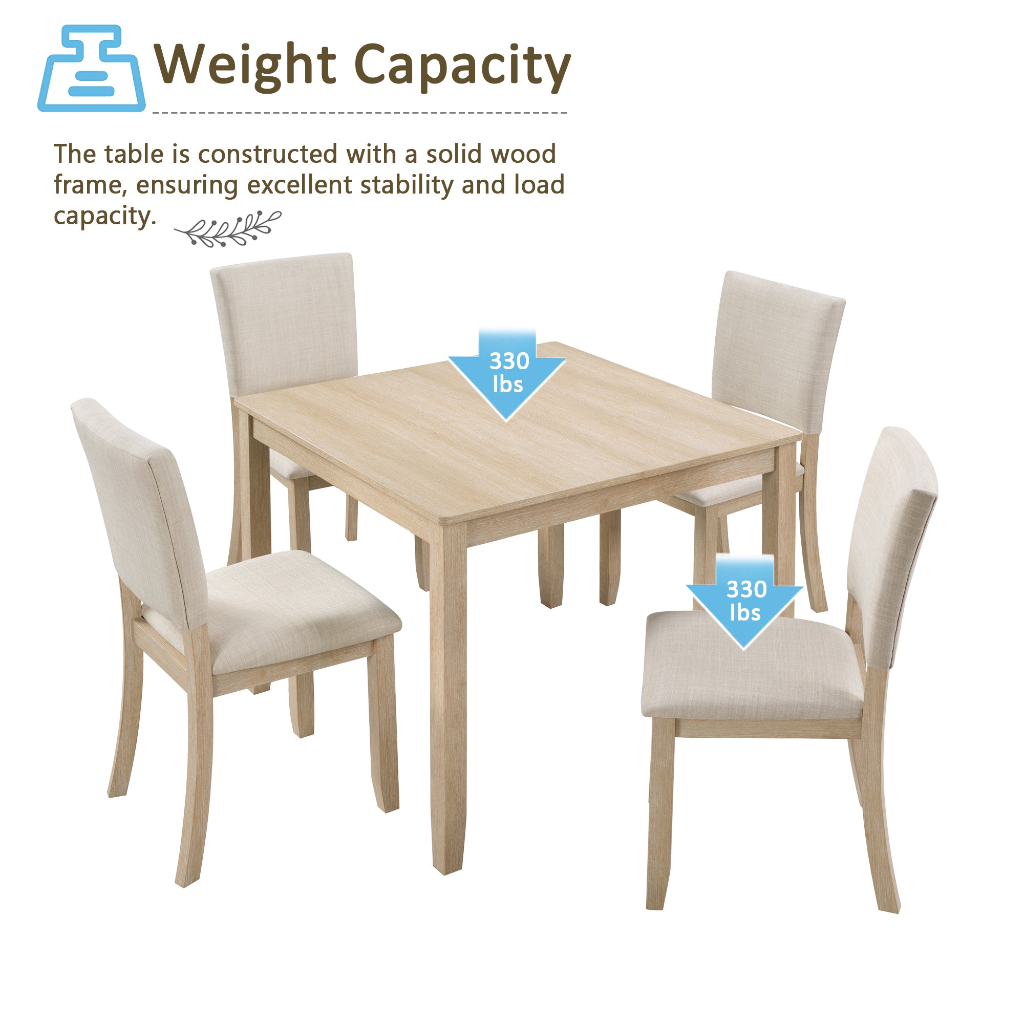 - Modern Wooden Dining Set: This kitchen dining table set includes one square dining table and four upholstered chairs. With a clear, detailed natural wood grain surface, this set has a clean, modern design that complements a wide range of interior décor styles. Perfect for kitchens, dining rooms or small apartments, it will bring a touch of elegance to any space
