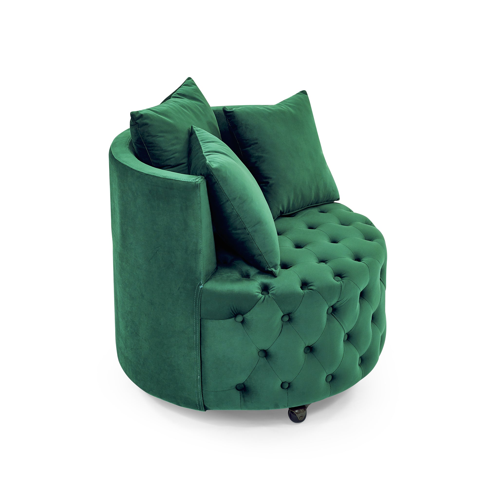 Velvet Upholstered Swivel Chair for Living Room, with Button Tufted Design and Movable Wheels, Including 3 Pillows, Green