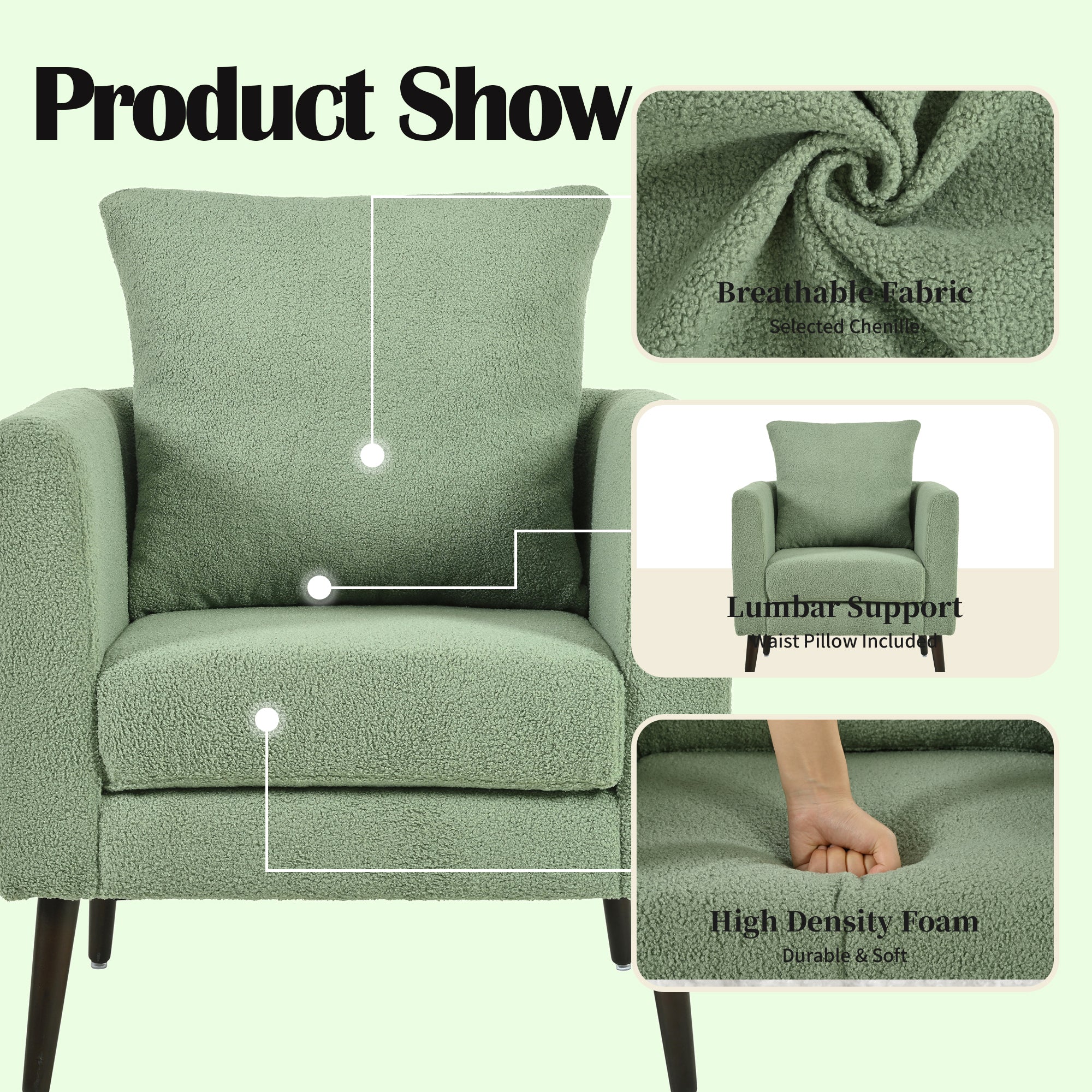 Modern Accent Chair – Upholstered Mid Century Lounge Armchair with Pillow & Wood Legs for Living Room, Bedroom, Reception Room (Light Green)
