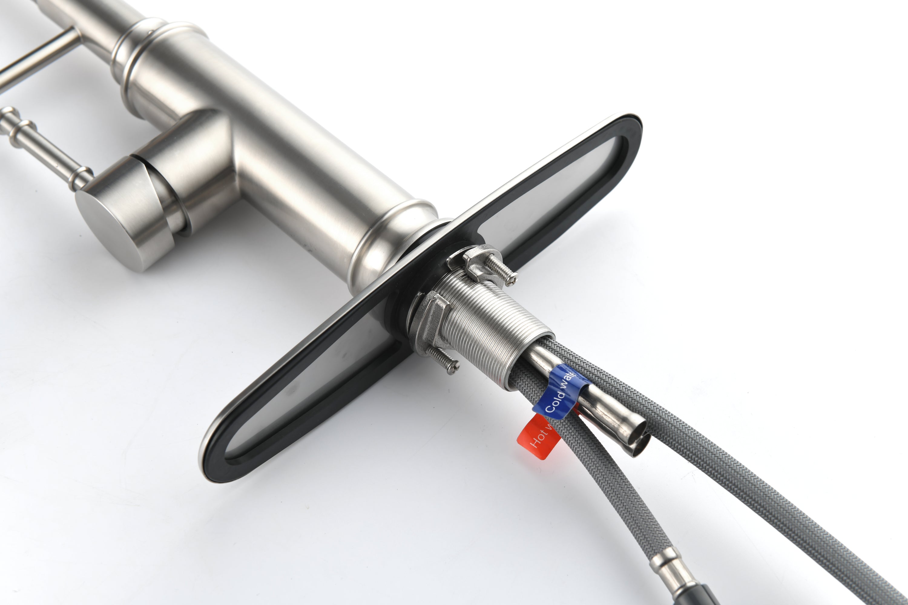 Upgrade your kitchen with the Commercial Kitchen Faucet featuring a single handle and pull-down sprayer with a spring design. This durable and functional sink faucet offers easy control with its single lever, perfect for both residential and commercial kitchens. The pull-down sprayer ensures convenient cleaning and rinsing, while the modern spring design adds a stylish touch to your kitchen. Ideal for sinks in kitchens, restaurants, or bars, this faucet combines convenience, style, and quality for your daily tasks. Crafted for reliability and long-lasting performance.