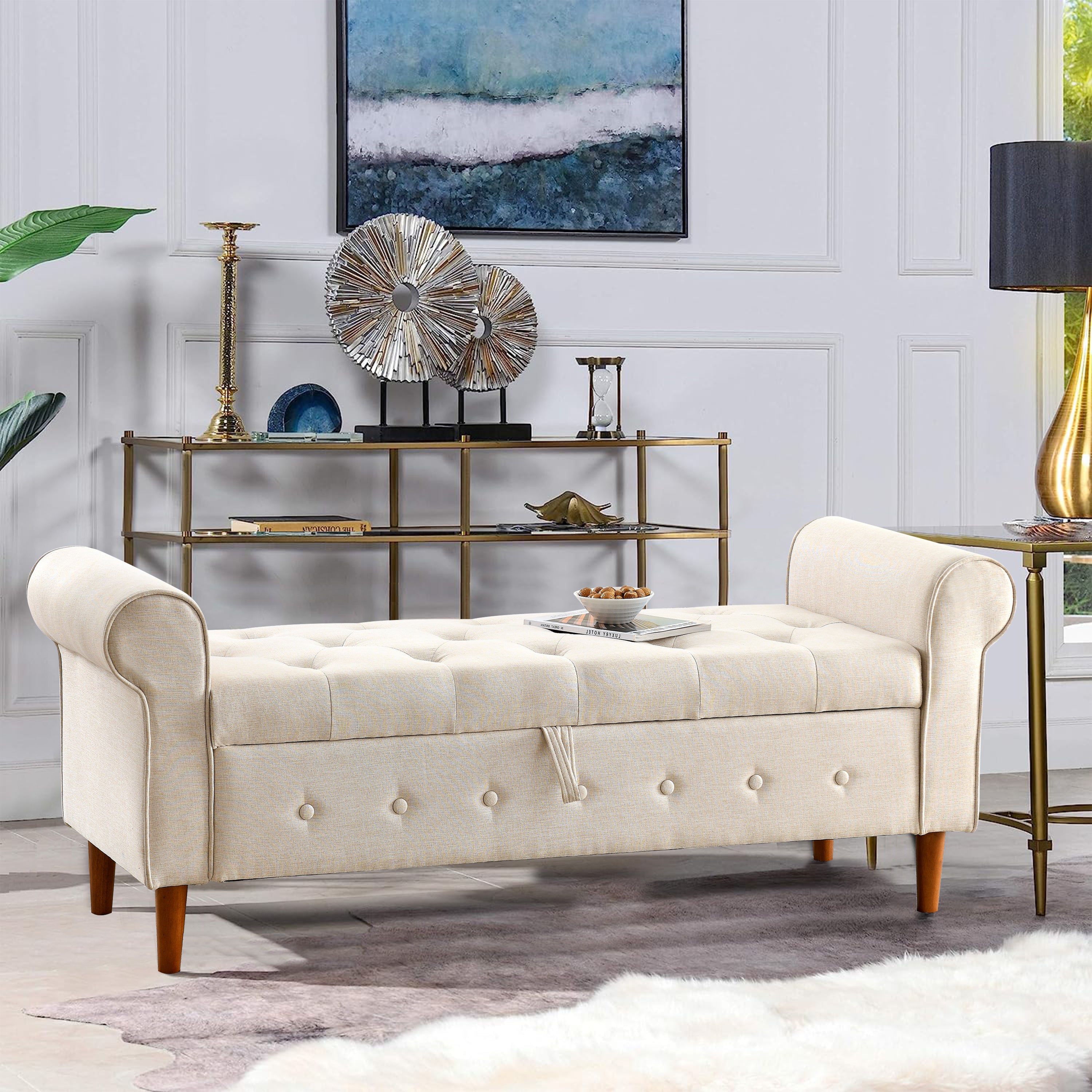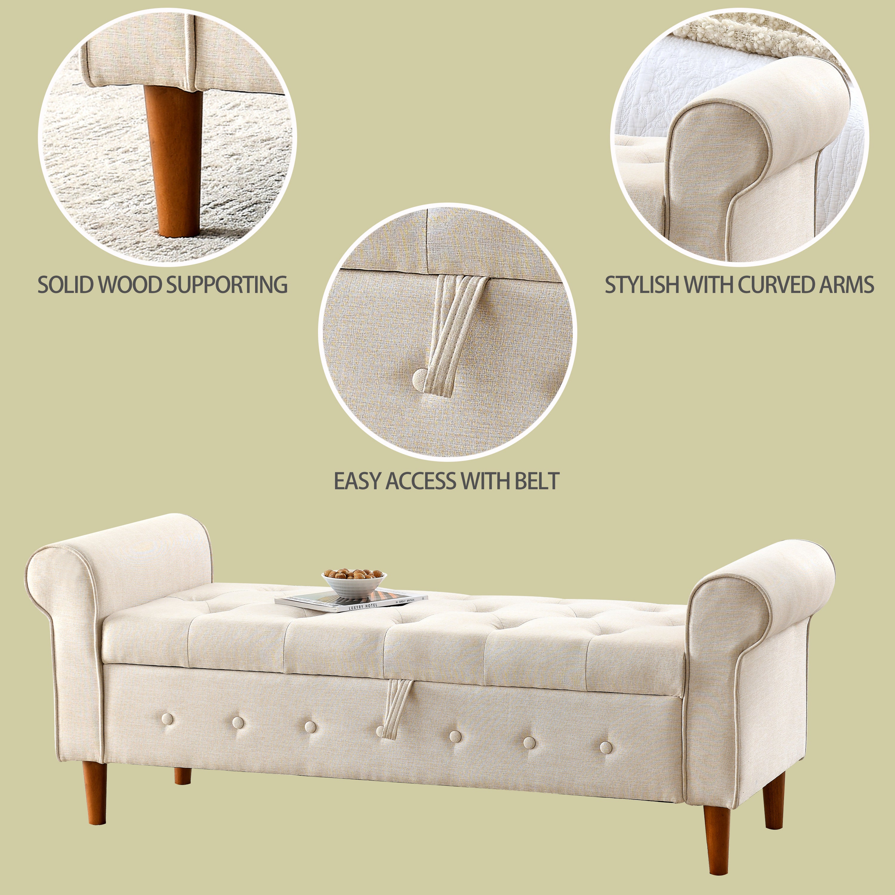 62" Bedroom Tufted Button Storage Bench, Modern Fabric Upholstered Ottoman, Window Bench, Rolled Arm Design for Bedroom, Living Room, Foyer (Beige)