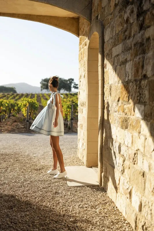 MABLE Zig Zag Embroidered Shoulder Tie Mini Dress