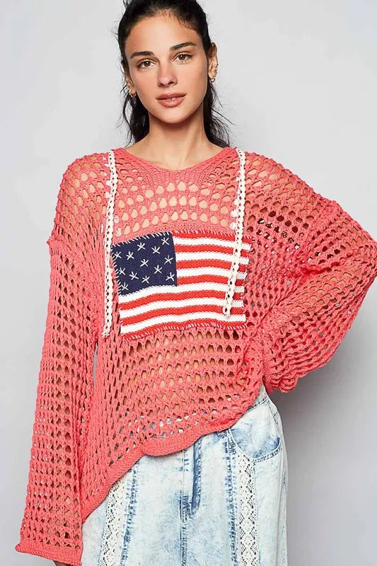 POL US Flag Hollow Out Long Sleeve Knit Cover Up