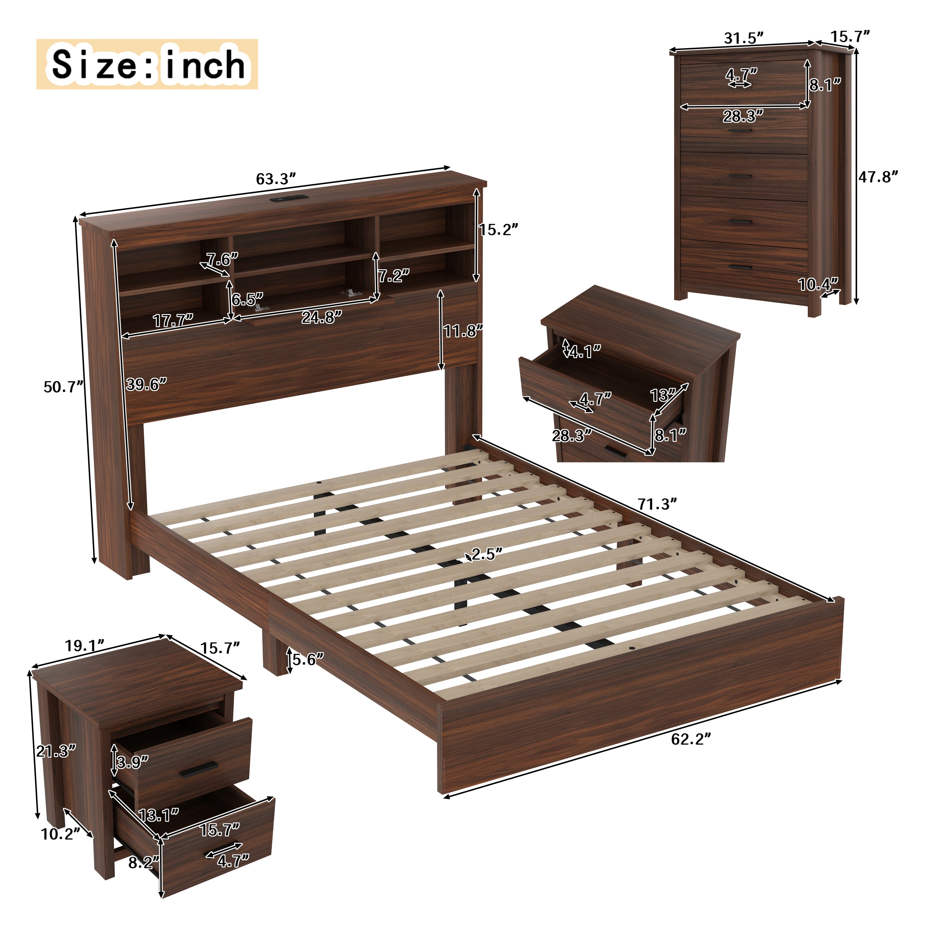 - 6. Product Dimension: Bed Frame: 87.5' x 63.3' x 50.7'(L x W x H), Dresser:31.5' x 15.7' x 47.8'(L x W x H), Nightstand:19.1' x 15.7' x 21.3'(L x W x H). Easy to assemble with clear instructions and all necessary tools included.