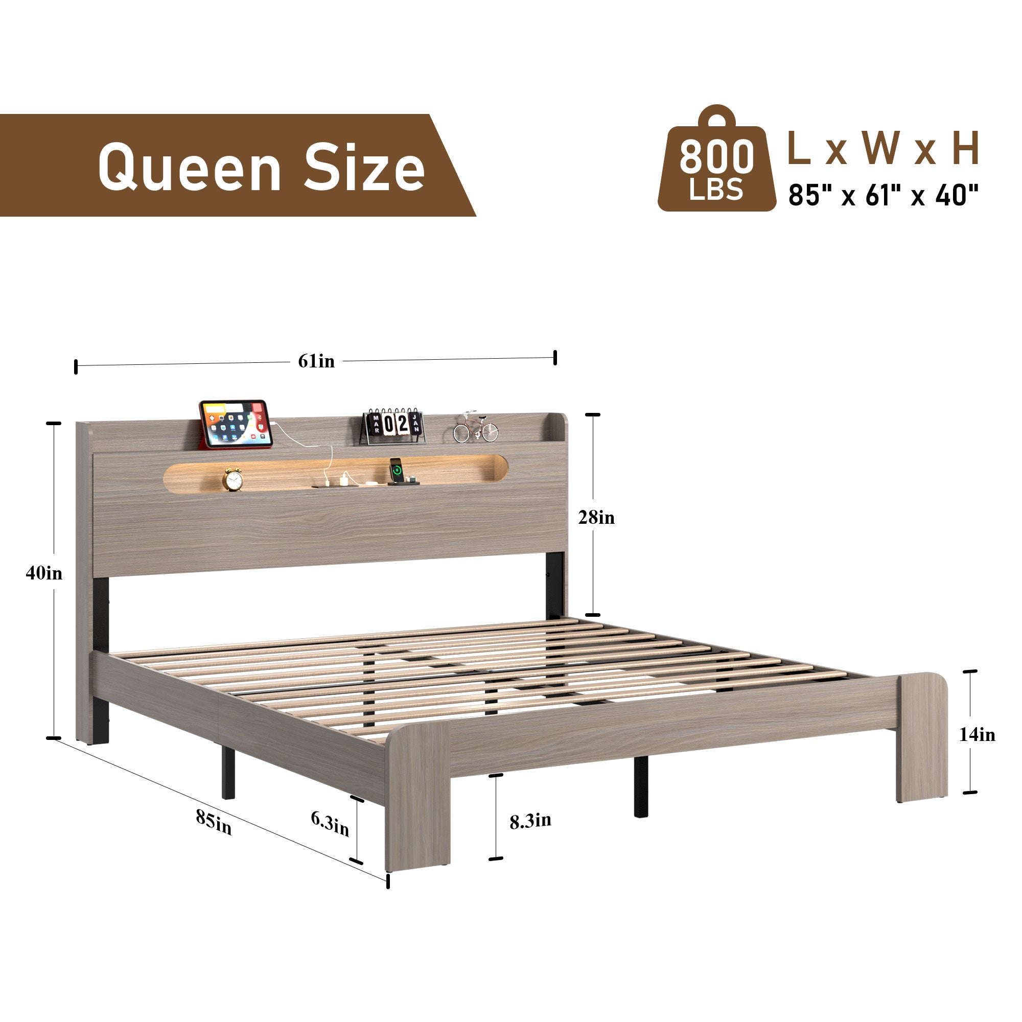 Queen Size Bed Frame with LED Headboard, USB & Storage | Dark Grey Wood Platform