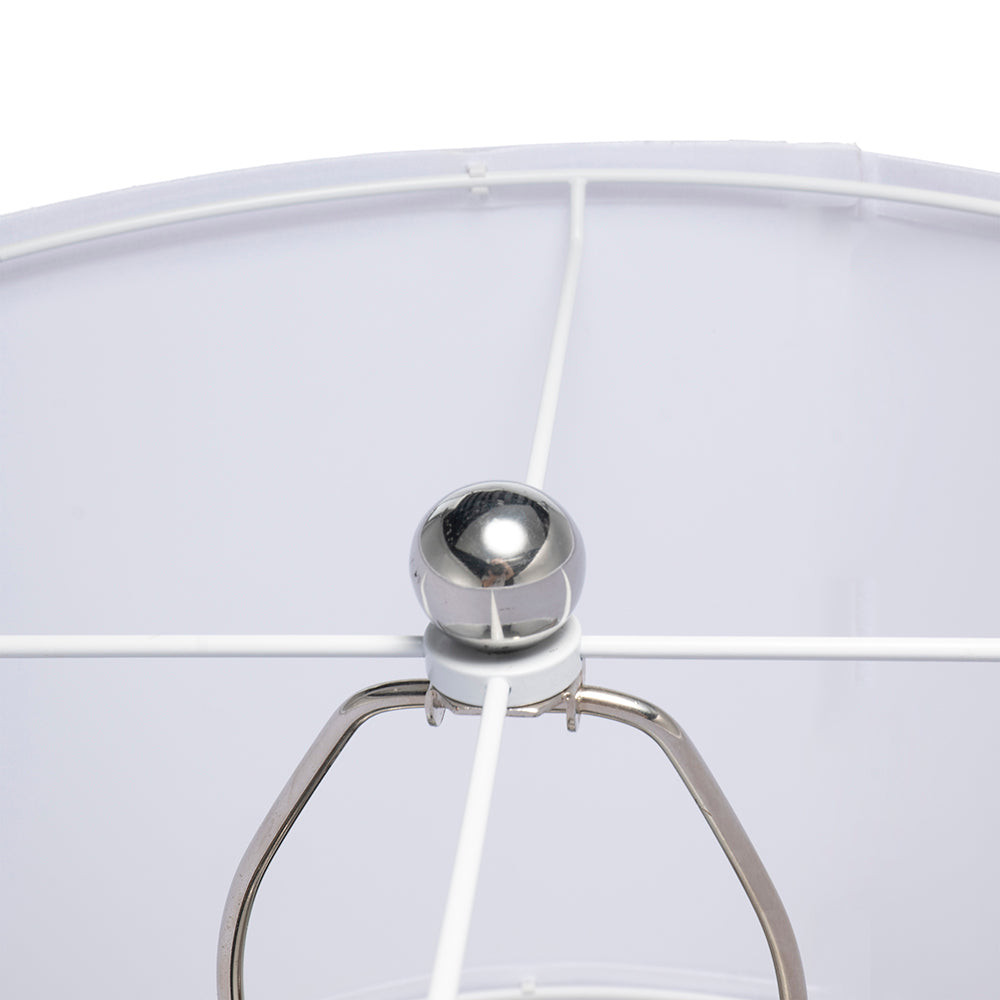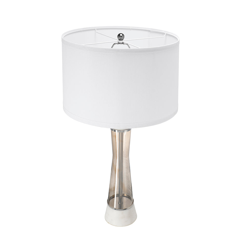 - Crafted from an alluring combination of durable, natural white marble and glass, this contemporary table lamp features a round pedestal base, a white drum shade, and a thin body that is coated by a transparent layer of glass.