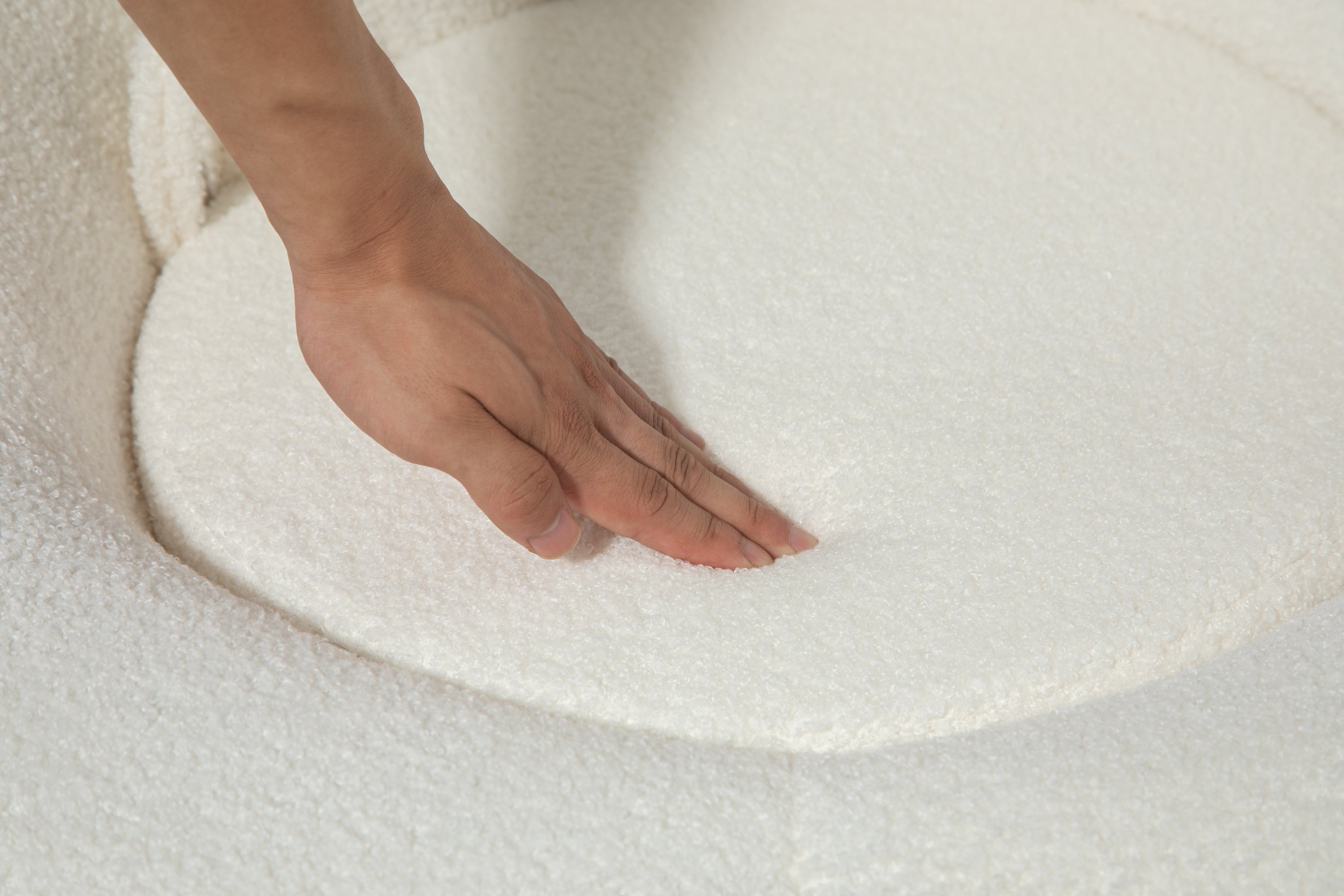 - The contemporary swivel bucket sofa chair, designed with a boucle barrel backrest and tilt armrest for a cozy sitting experience. The wide upholstered features high-quality high-resilience foam, providing excellent cushioning performance and supporting weights up to 300 pounds.
