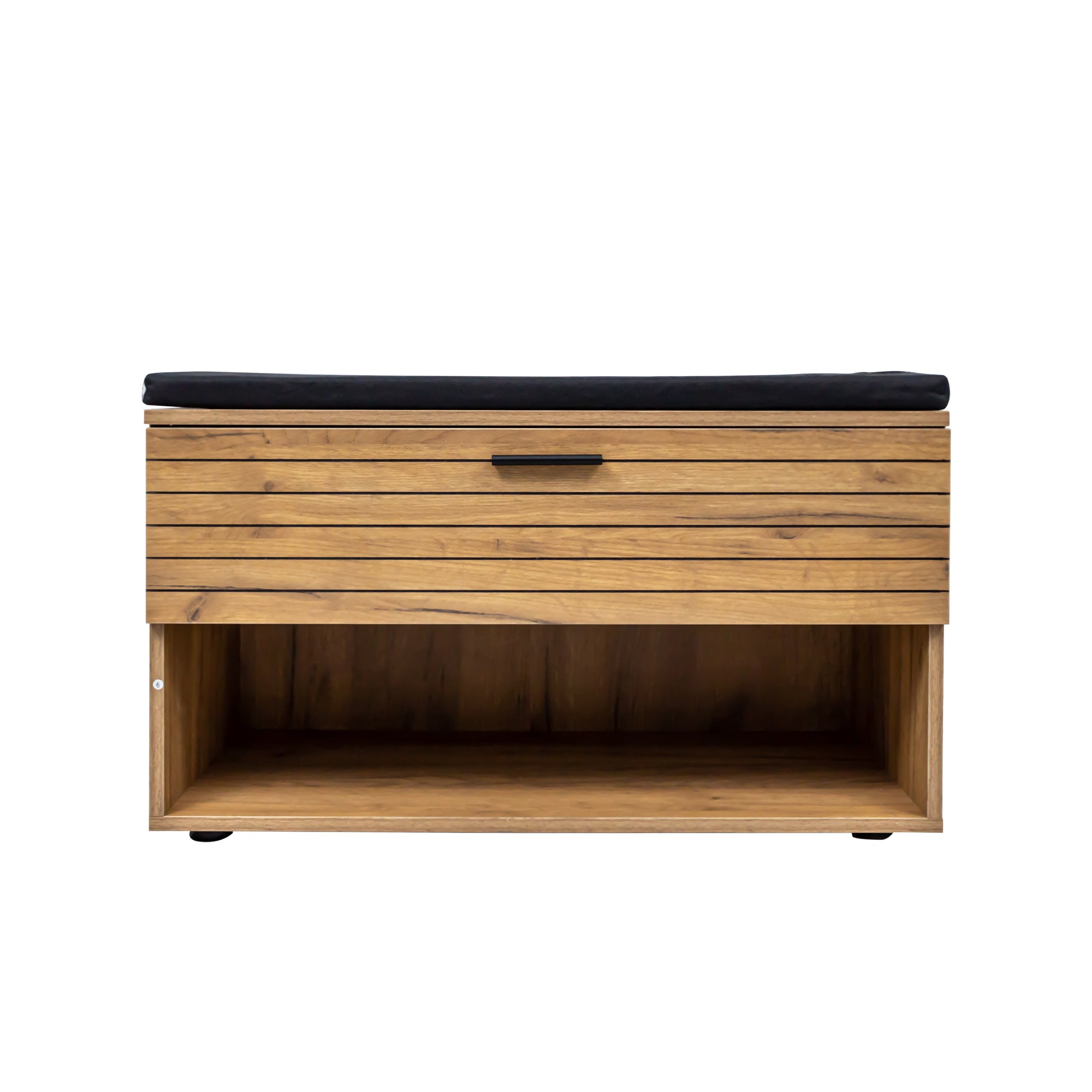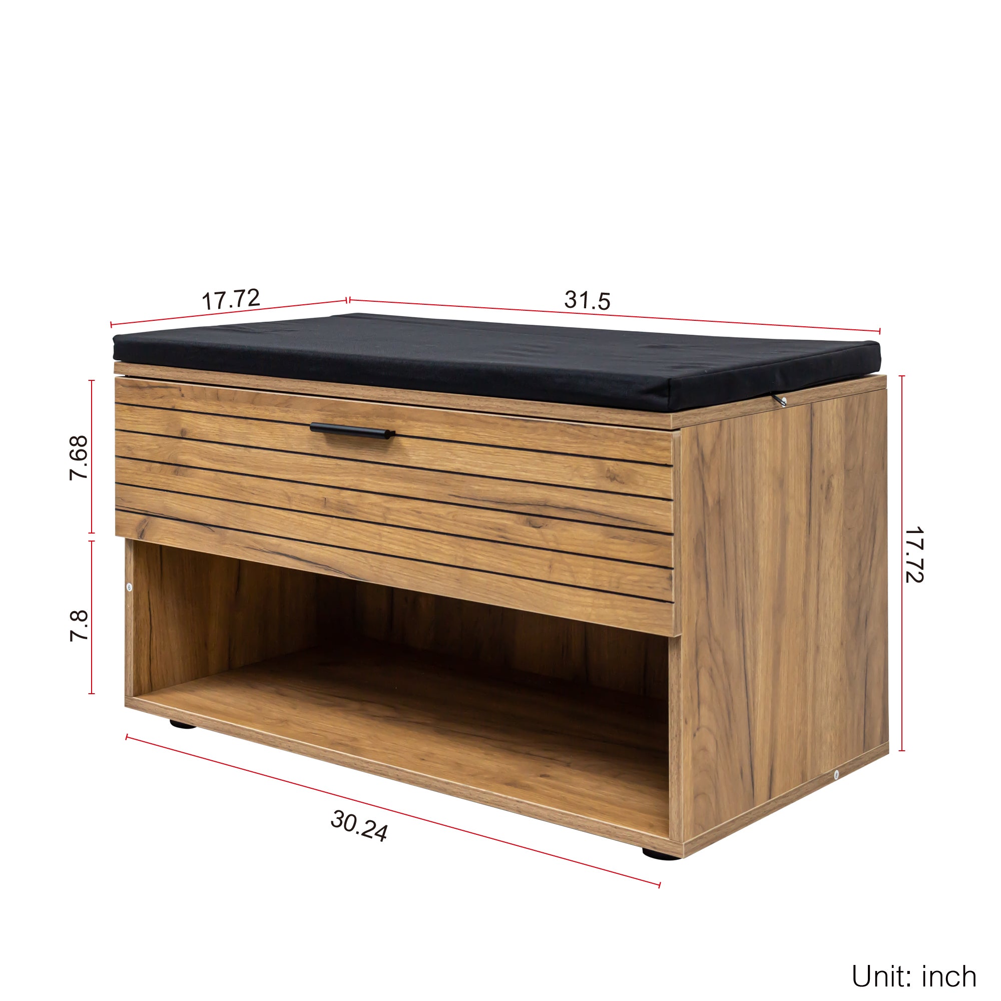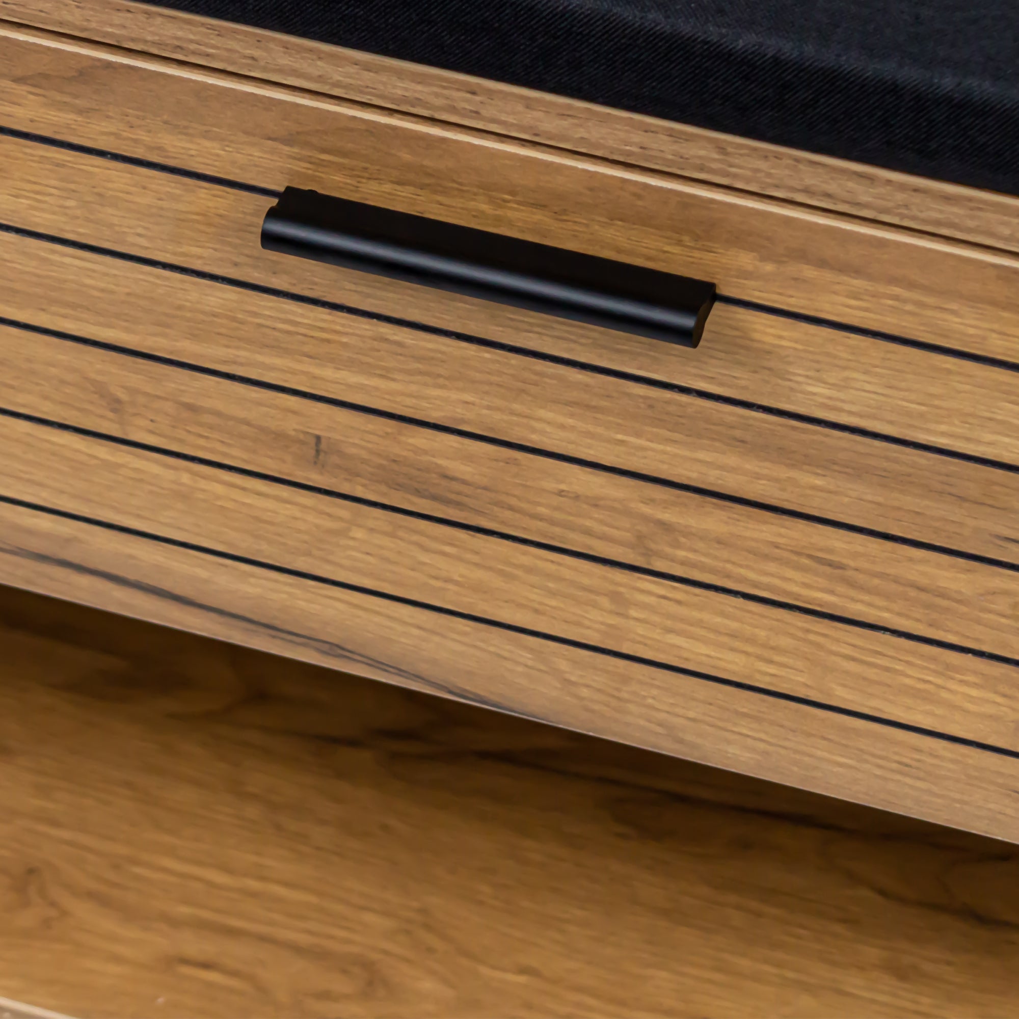 - this unit includes a comfortable bench where you can conveniently sit to change your shoes. Additionally, underneath the bench, there are drawers and open compartments, providing ample storage for various items.