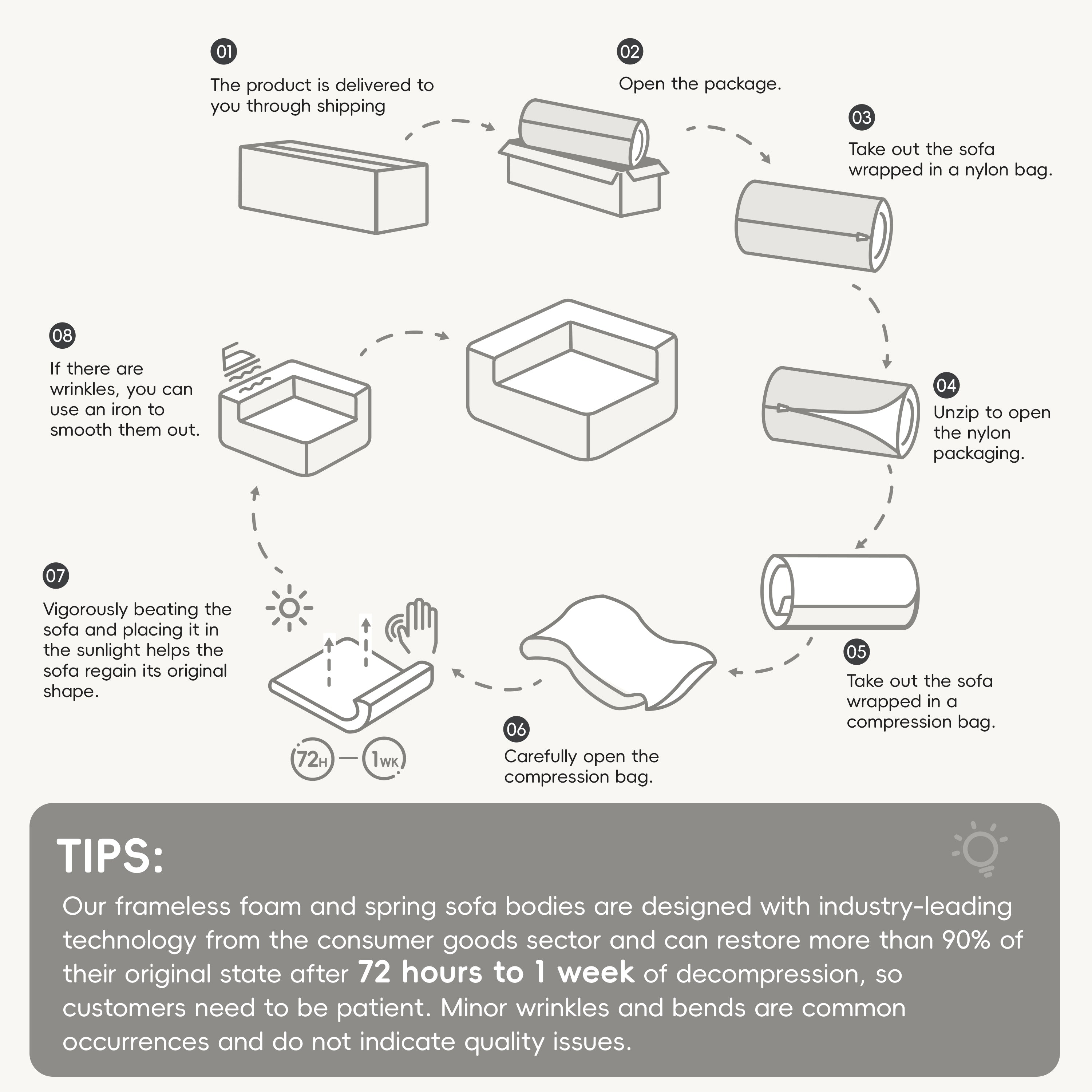 - Vacuum-Sealed, Unpack-and-Use:This full-compression sofa features a convenient vacuum-sealed, unpack-and-use design. It arrives in a compact, compressed form that makes shipping and handling easier. Once you receive the sofa, you simply unpack it and let it expand to its full size—no assembly required. The ease of unpacking and setting up the sofa makes it an ideal choice for those who want a hassle-free furniture experience.