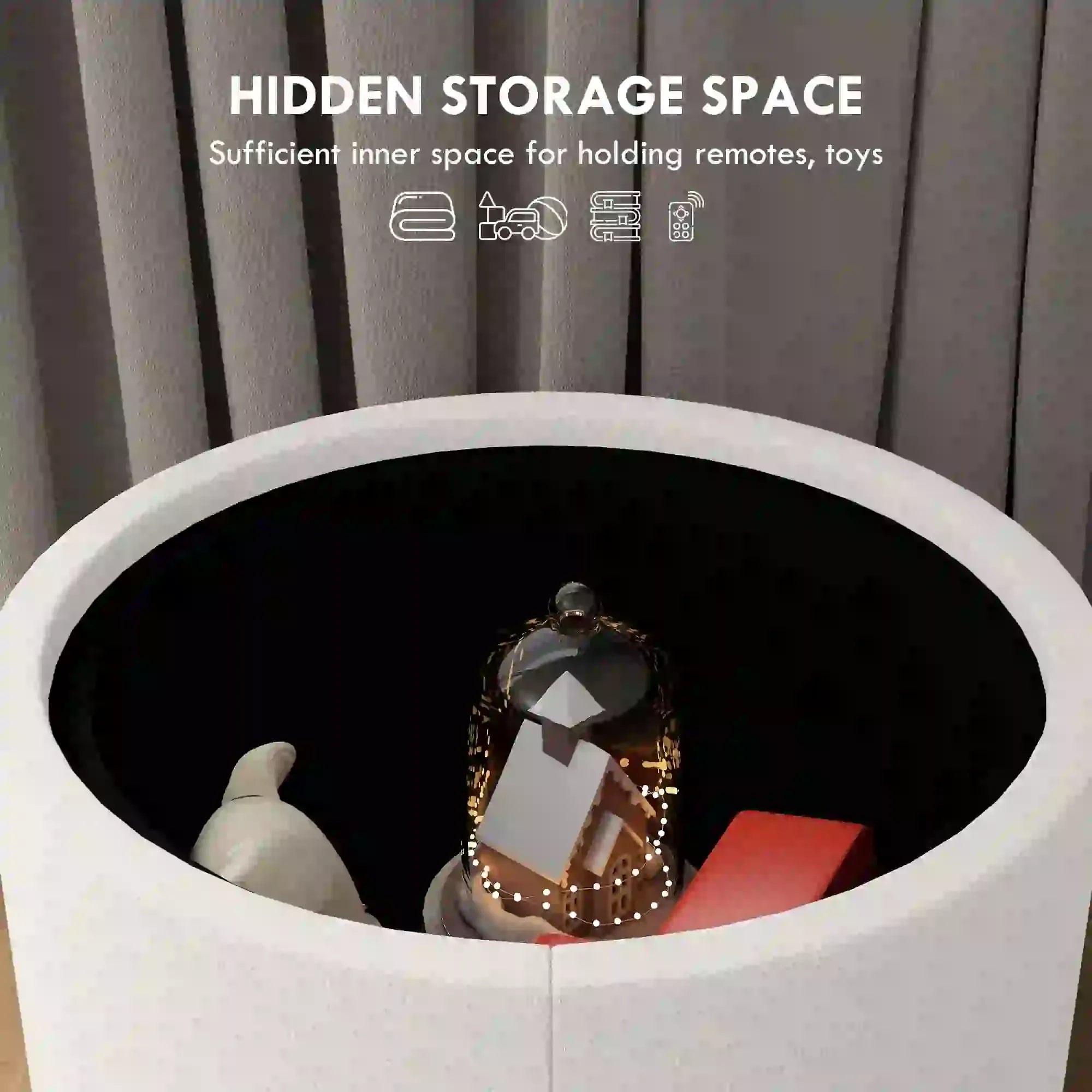 - Versatile Use: Whether it's used as a temporary coffee table or a round footstool in the living room, a shoe-changing stool in the entryway, or a vanity stool next to the dressing table, this ottoman with storage is suitable for various settings.