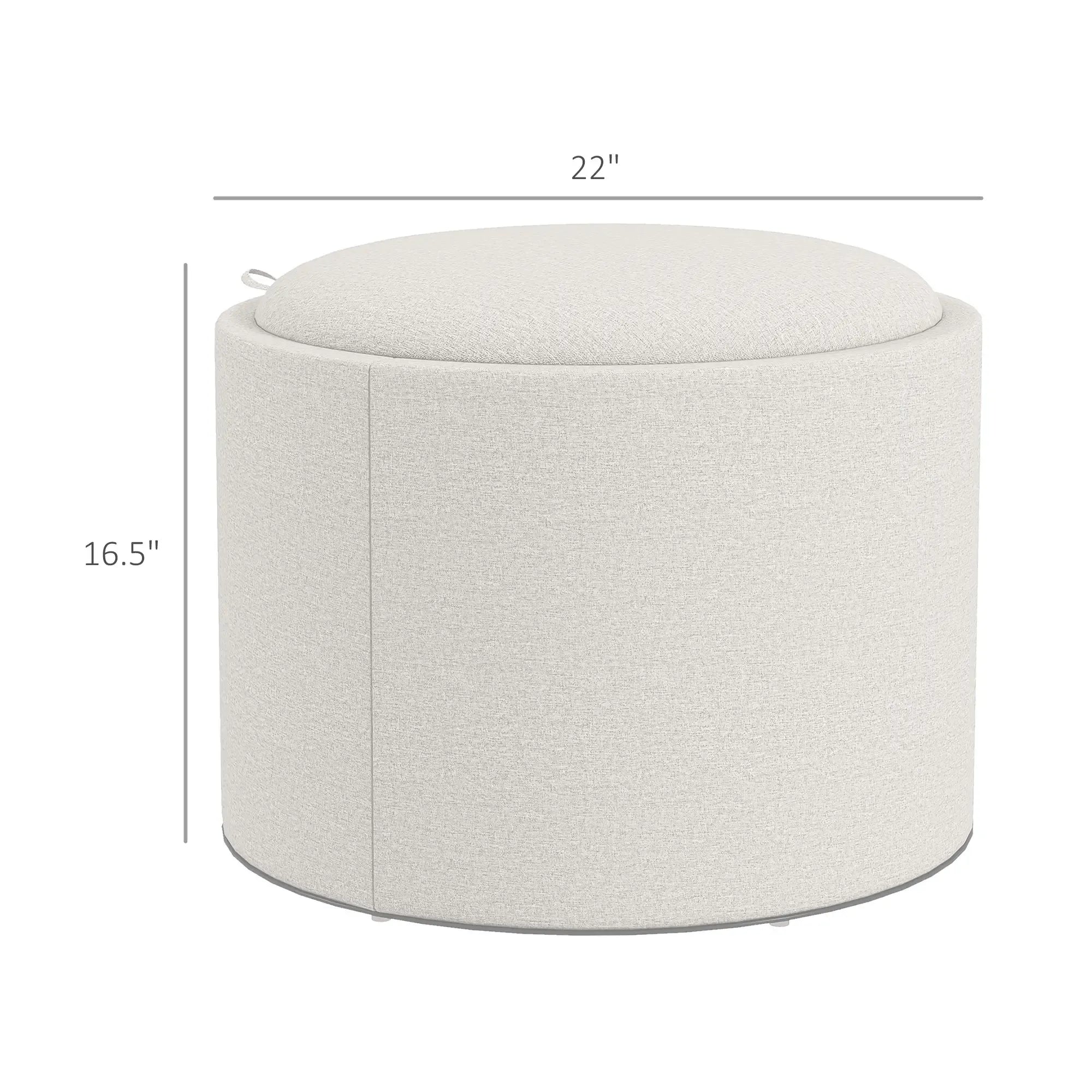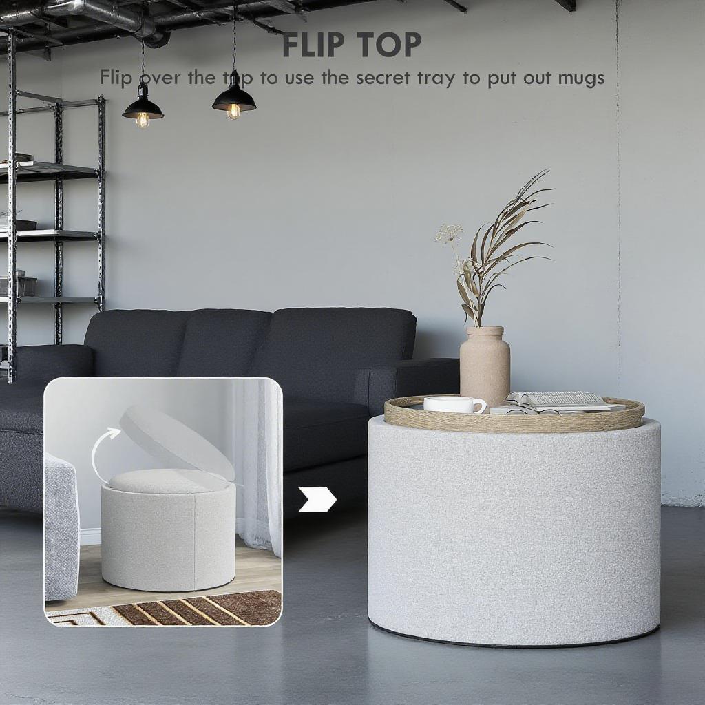 Round Storage Ottoman with Flip Top Tray Linen Fabric Upholstered Footstool