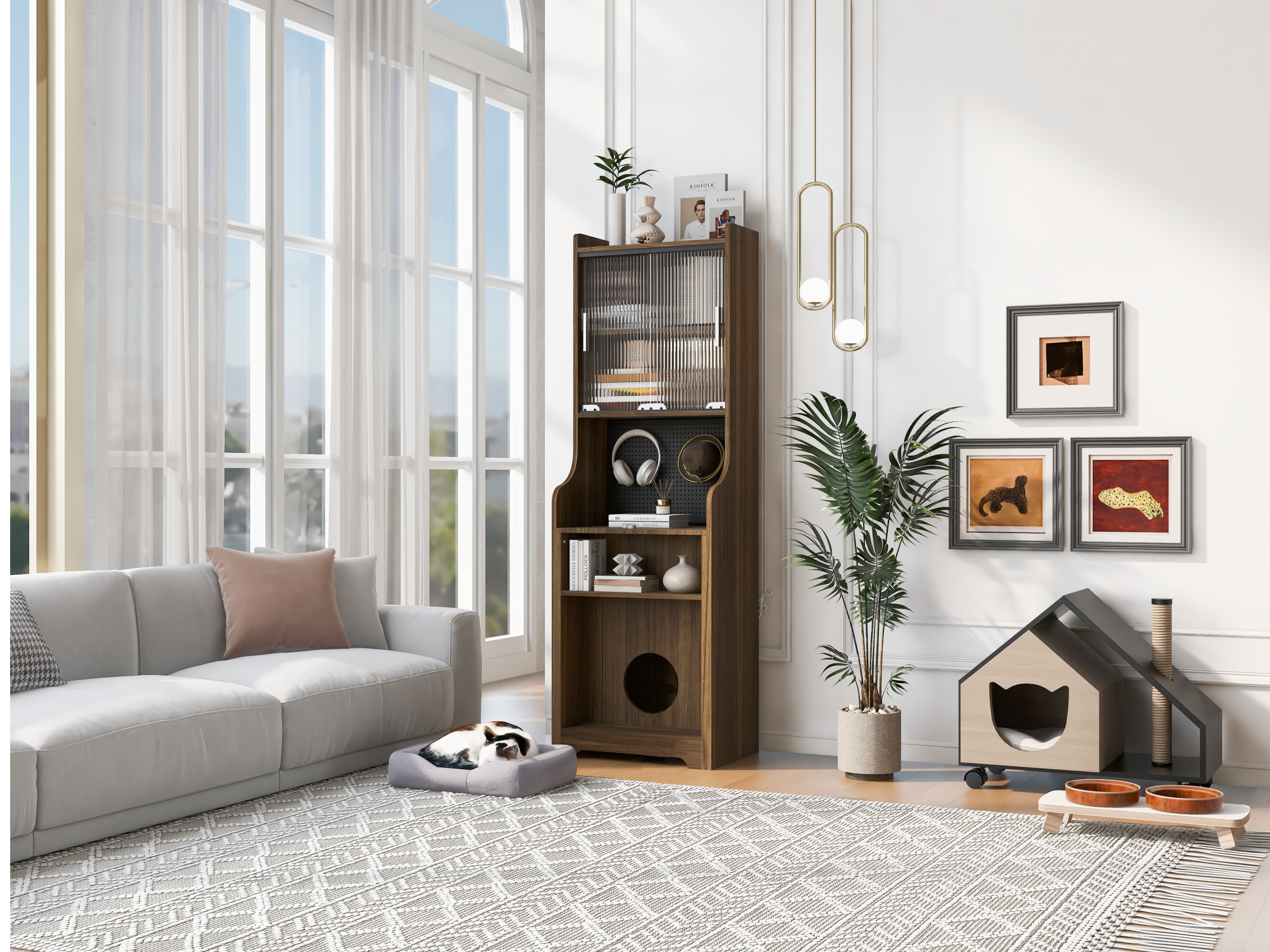 Product Description: Seamlessly blend your decor with your pet's needs with this Mid-Century Modern Walnut multi-use cabinet. This innovative piece functions as a stylish storage unit for you while providing a built-in cat scratcher and cozy cat bed for your feline friend. The beautiful Walnut finish and vintage-inspired design make it a stunning addition to any room, finally offering cat friendly furniture that you'll be proud to display.