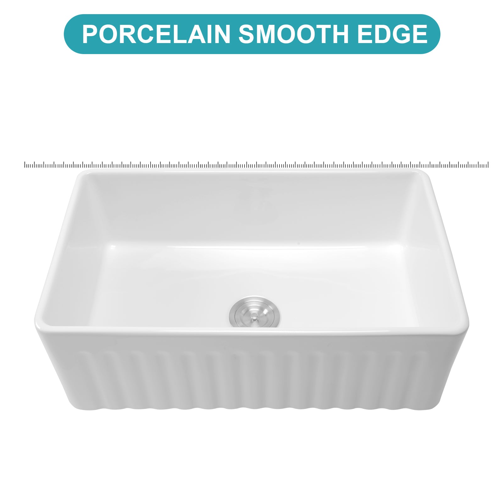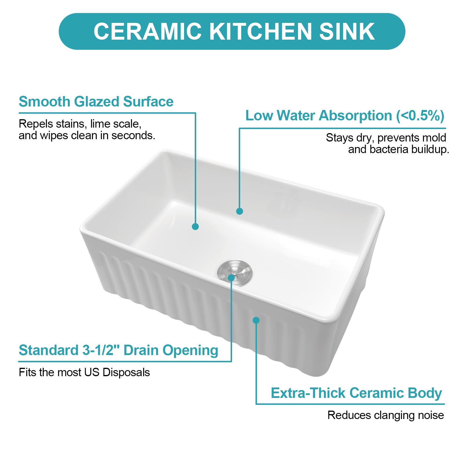 - This 33 inch white kitchen sink constructed of ceramic for extreme strength and durability. Kitchen Sink surface is extreme resistance to chips, abrasion or scratches and discoloration for years of beauty and reliable performance.
