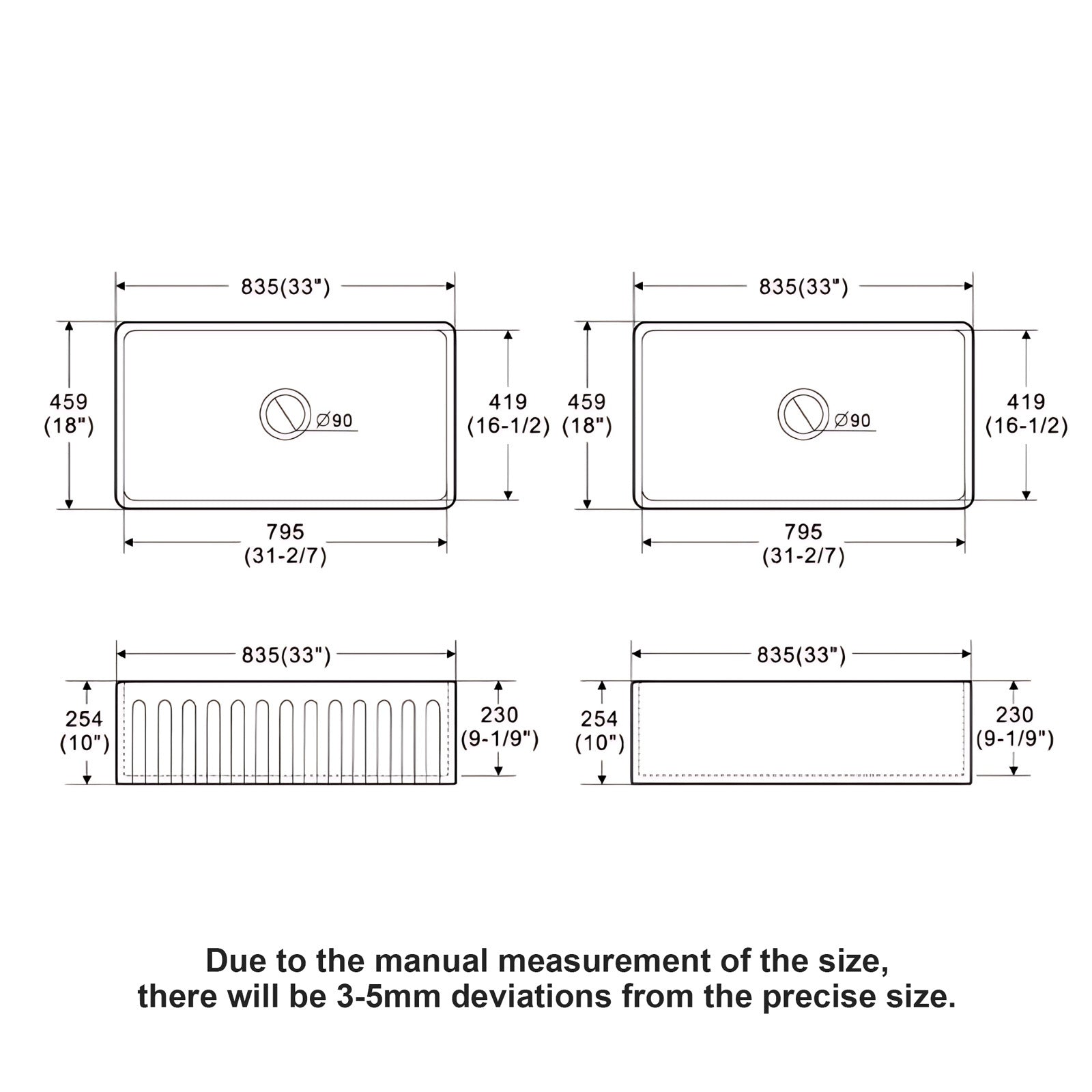 - [Stylish Deep White Kitchen Sink Size] Exterior-33' x 18' x 10'. Large single bowl kitchen sink has exactly an appropriate size to fit into more cabinets. With enough depth to hold and clean pans, pots and grills without splashing around, this deep kitchen sink helps you tackle more housework at once.