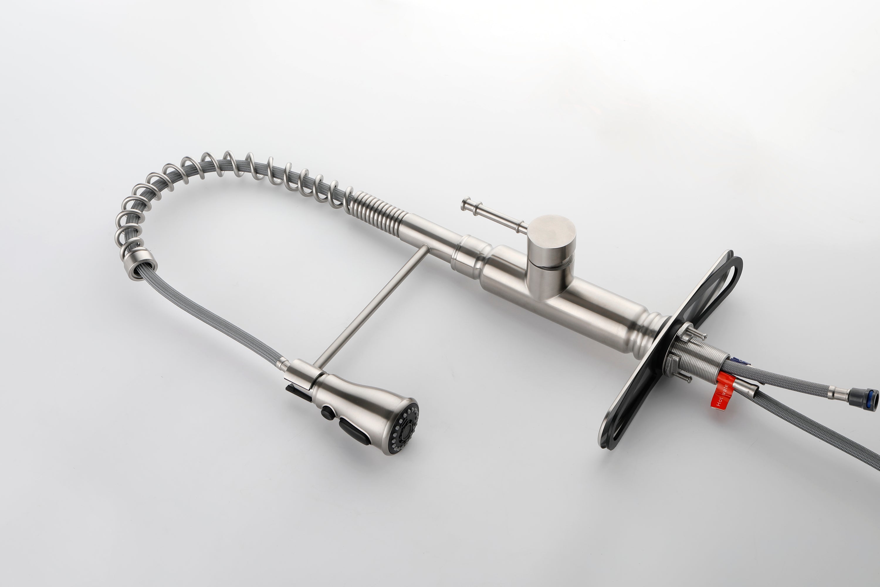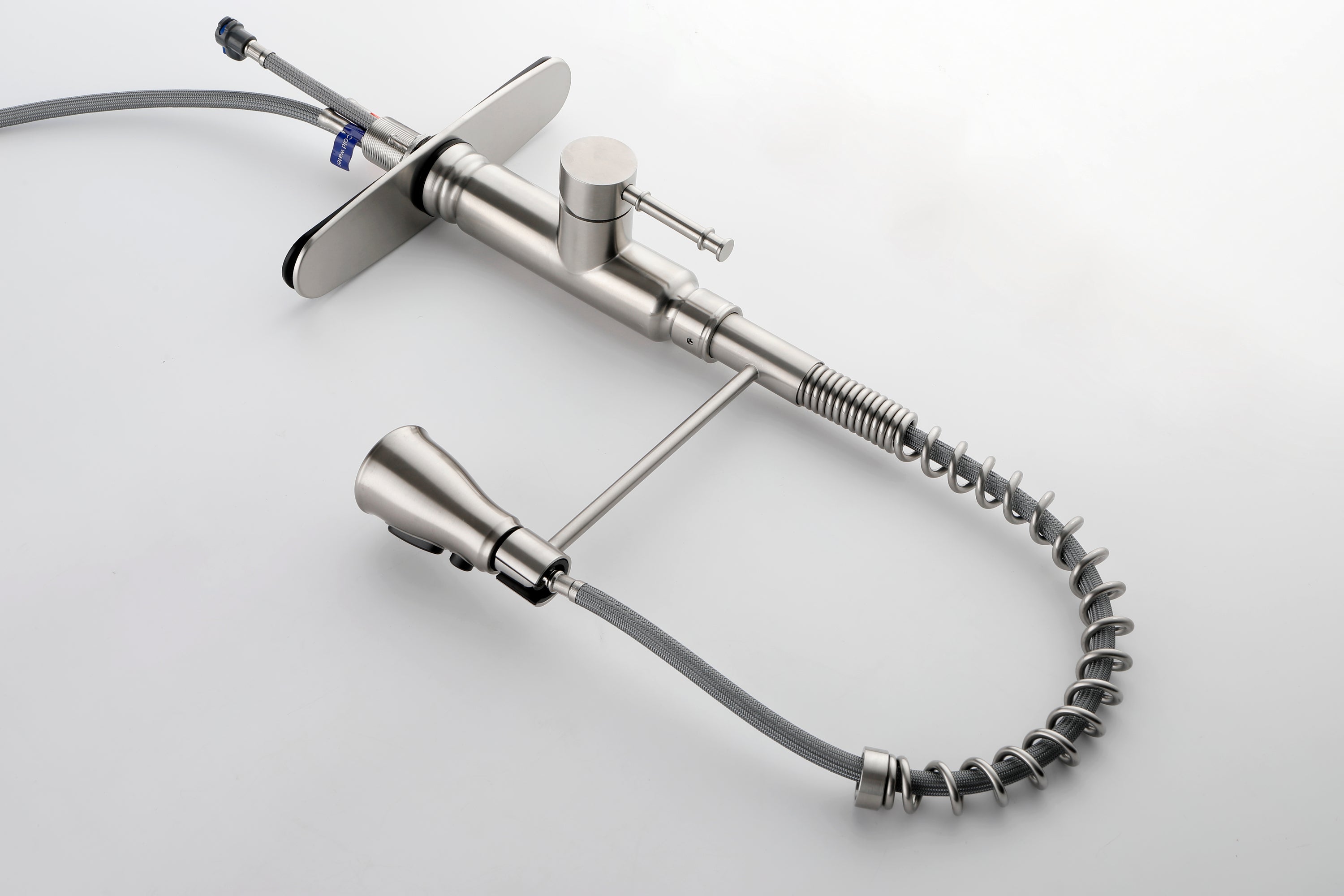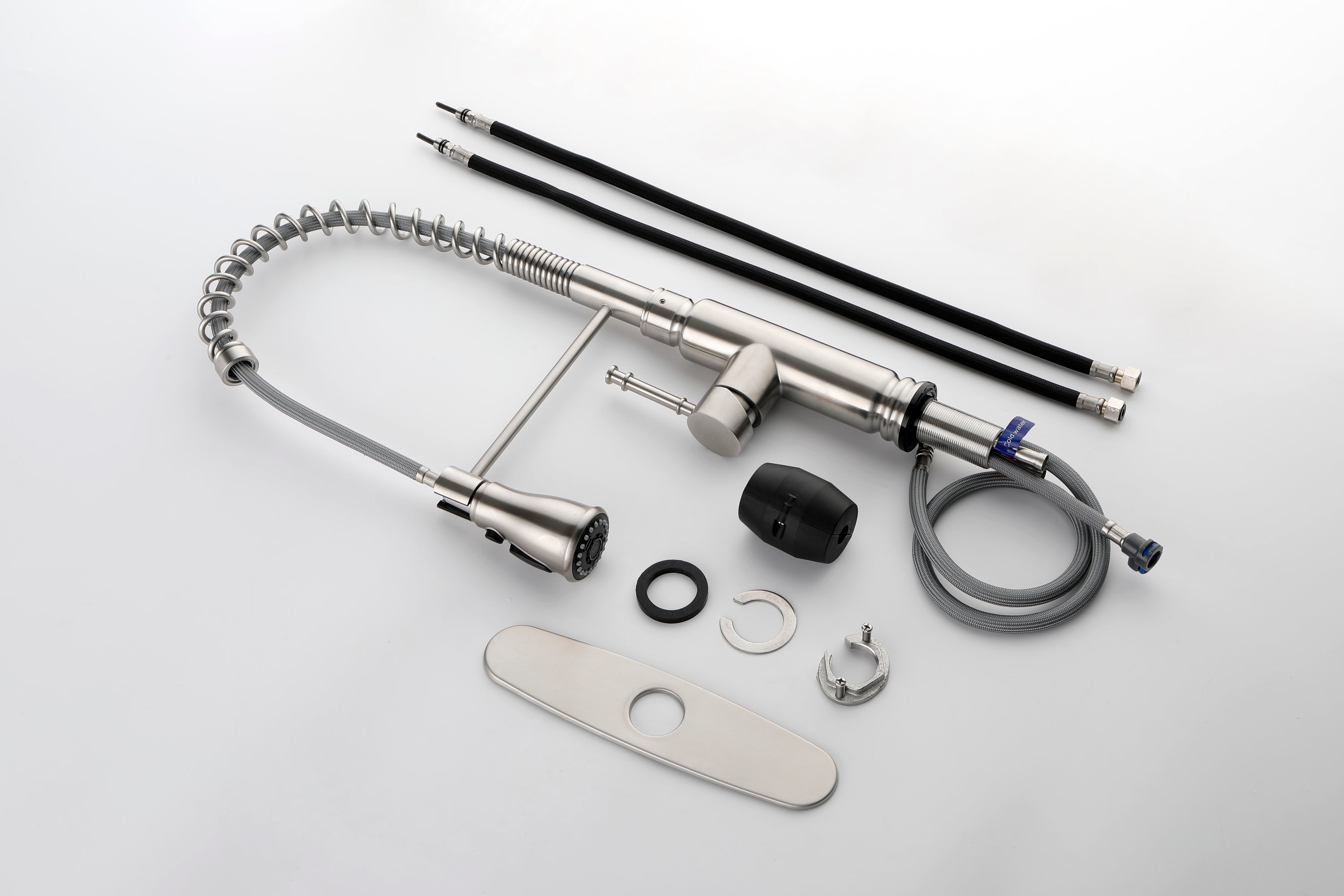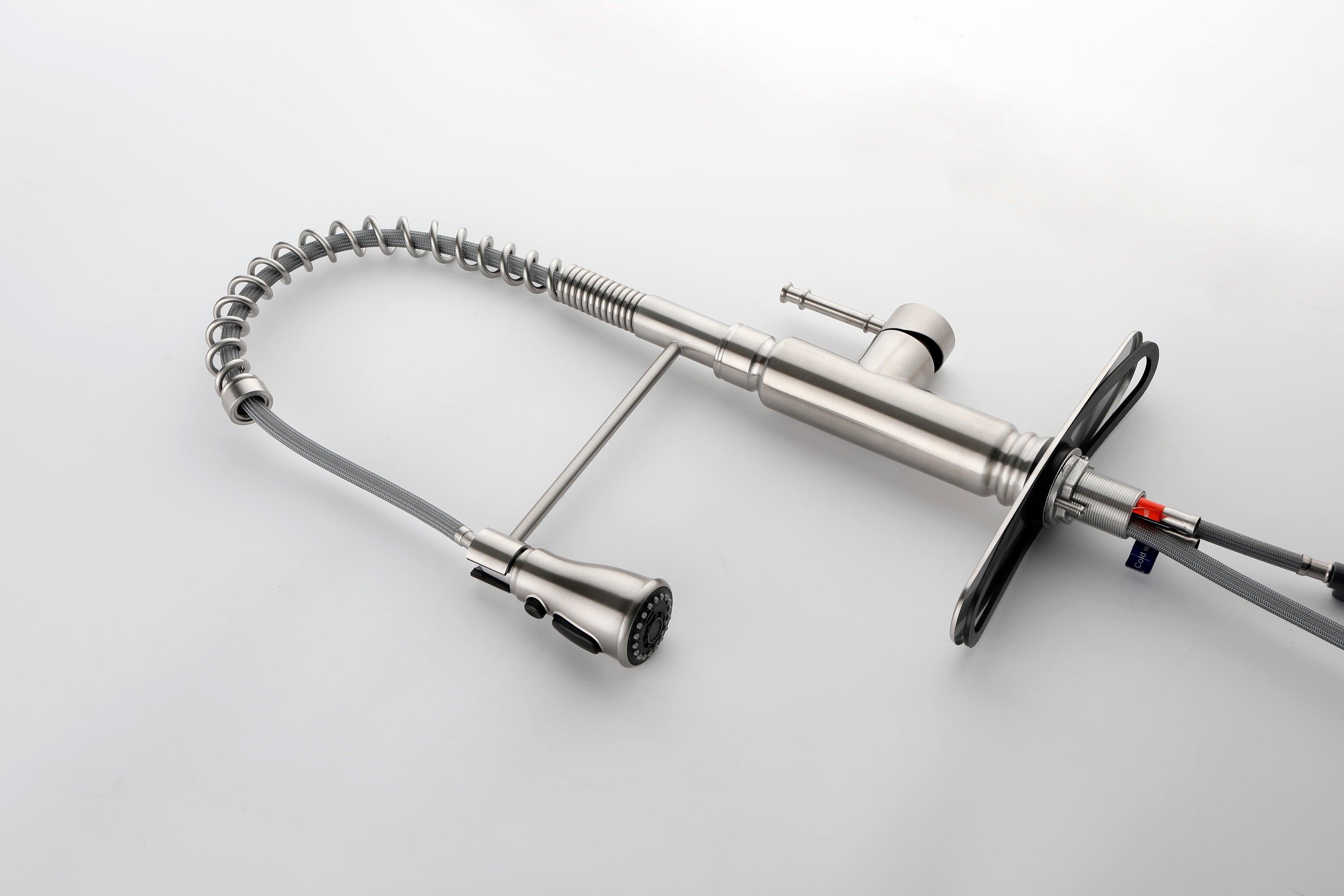 - EASY TO USE: Faucet pulldown hose offers flexible water delivery and hose retracts with ease; One-handle lever handle makes it easy to adjust the water Offers 3 times more reach when compared to most residential pre-rinse spring faucets SIMPLE INSTALLATION: Features quick connect system for easy installation; Standard design mounts on the sink or countertop DISTINCTIVE ACCENTS
