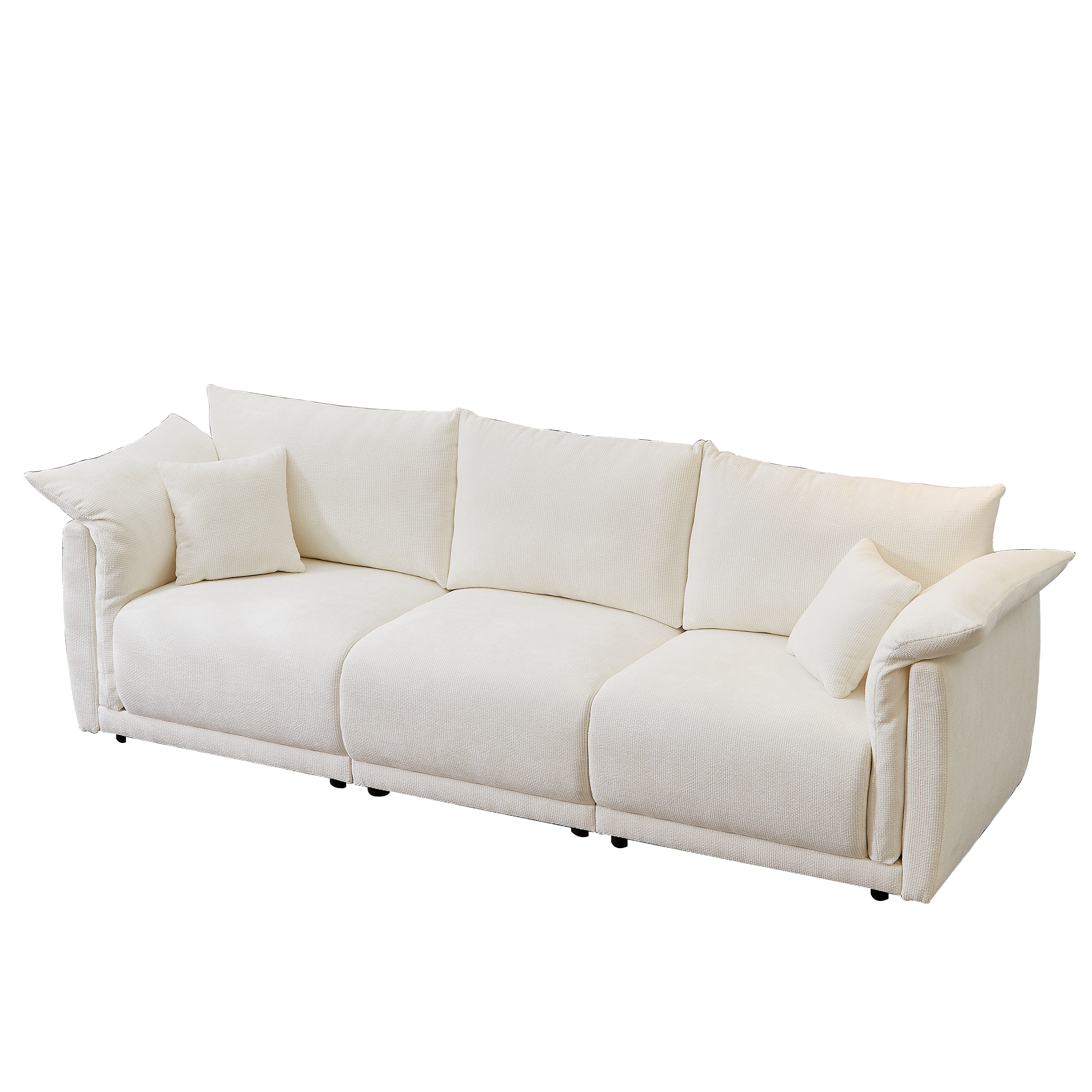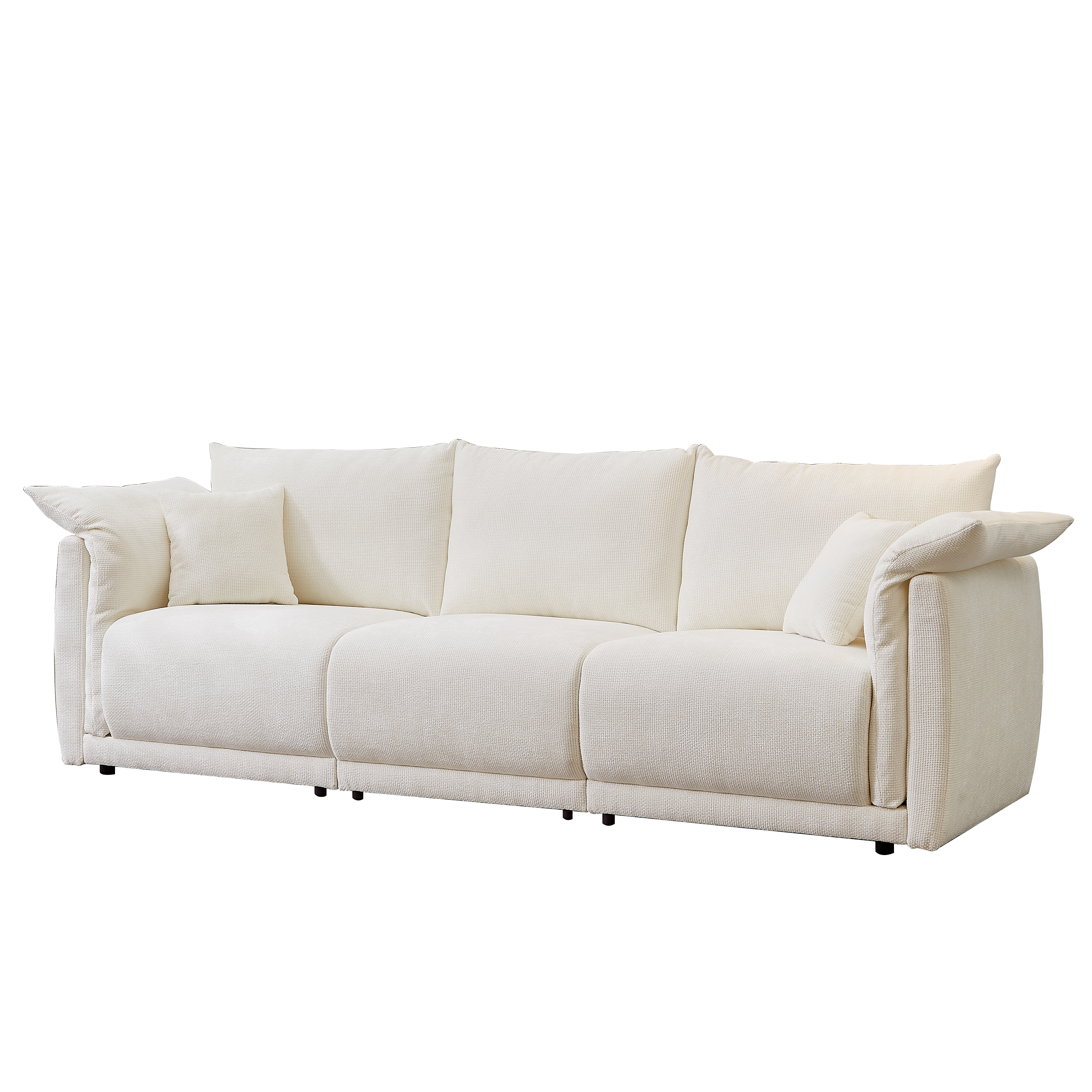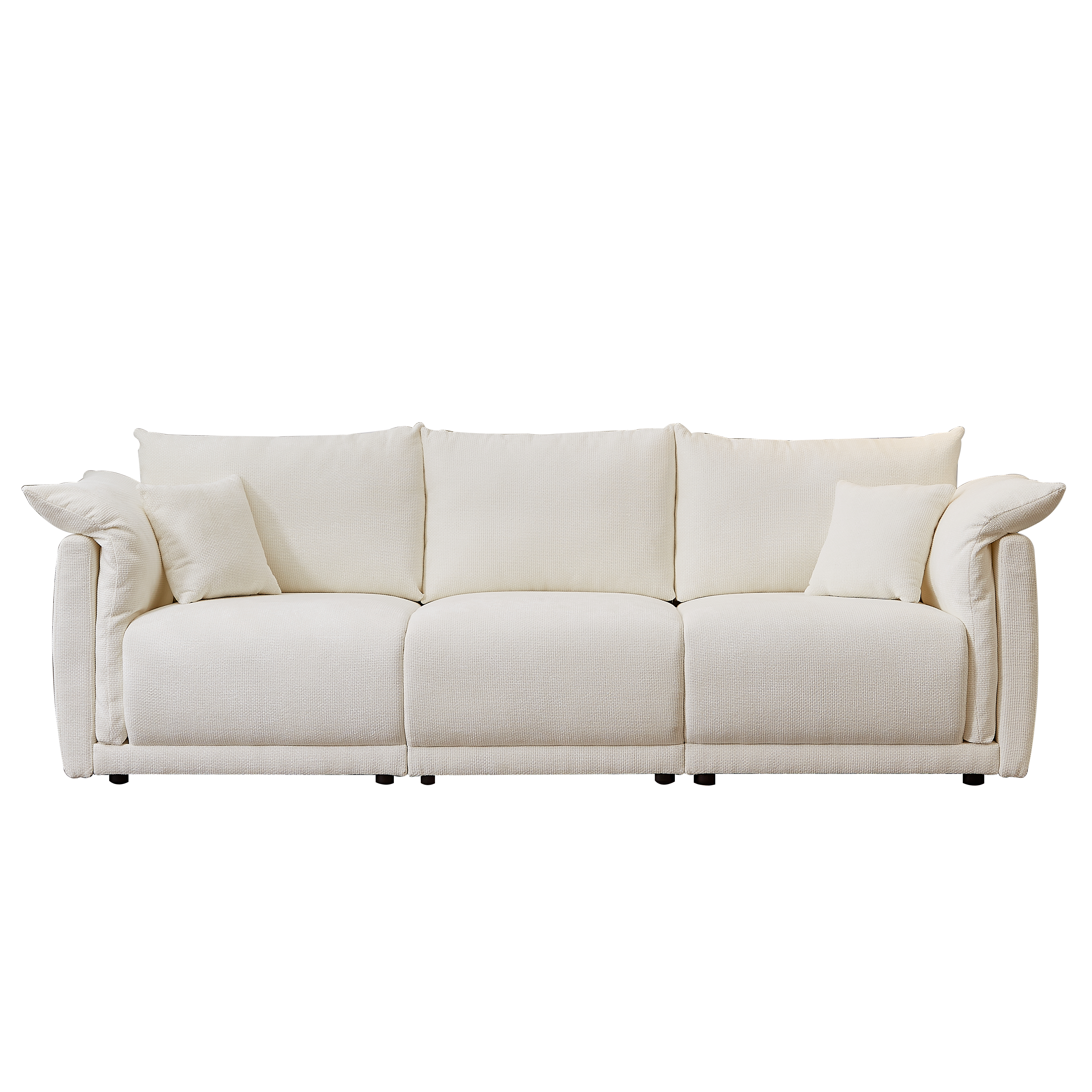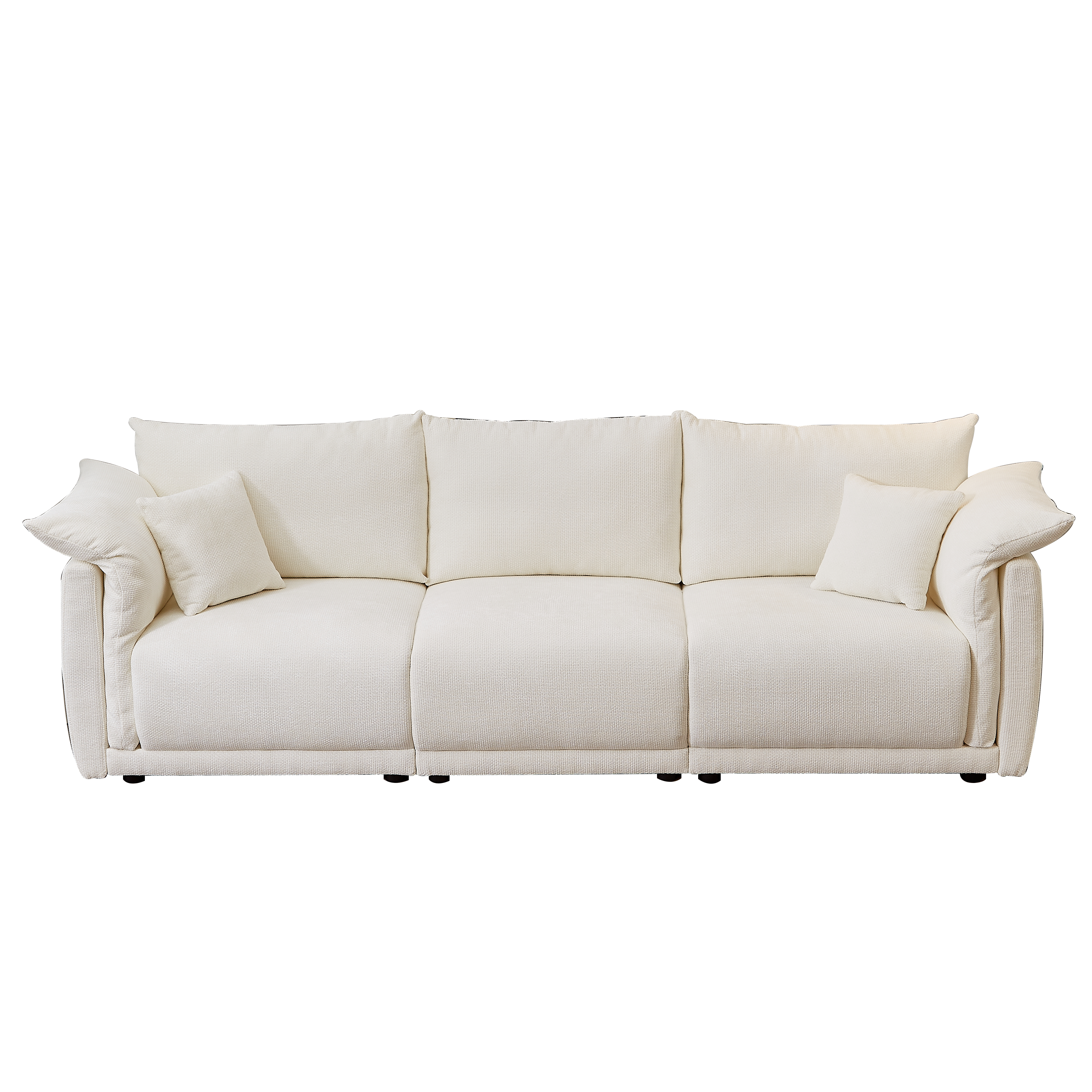 Upgrade your space with this elegant 98.5" 3-Seater Contemporary Sofa in a versatile beige linen upholstery, designed to bring comfort and modern style to your living room, bedroom, or office. With a unique design, this spacious sofa features three plush seat cushions and two soft armrest pillows, offering both relaxation and visual appeal.