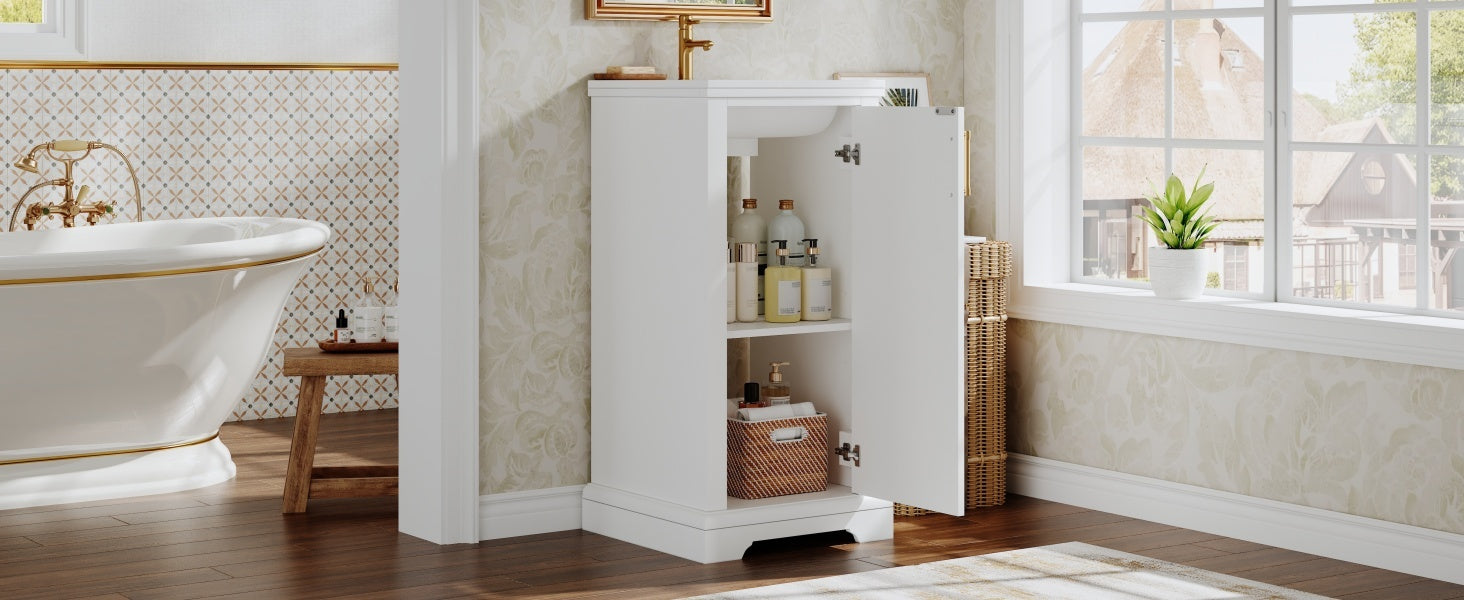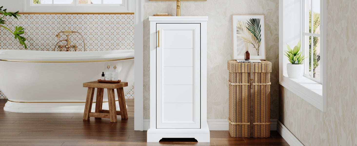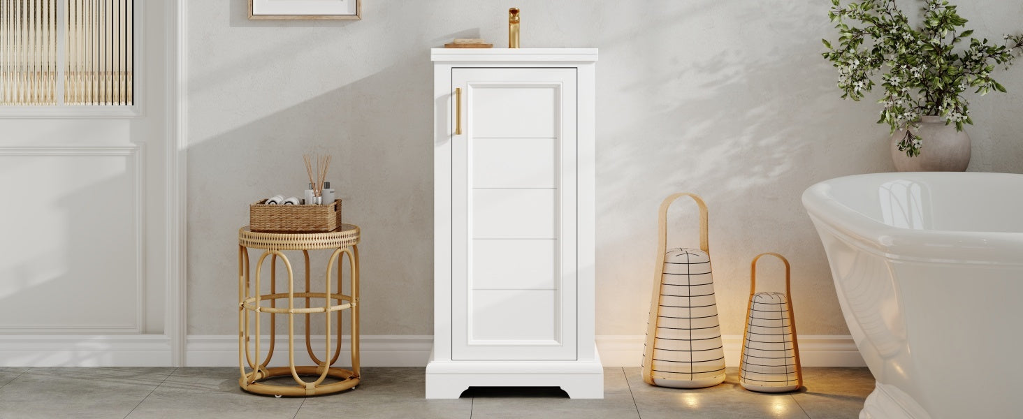 • Versatile Storage: This 16-inch modern vanity cabinet features a spacious interior, providing ample room for cleaning supplies, towels, toiletries, and other bath essentials. This wood vanity will help you keep your bathroom or powder room tidy and organized while adding a classic look to your home.