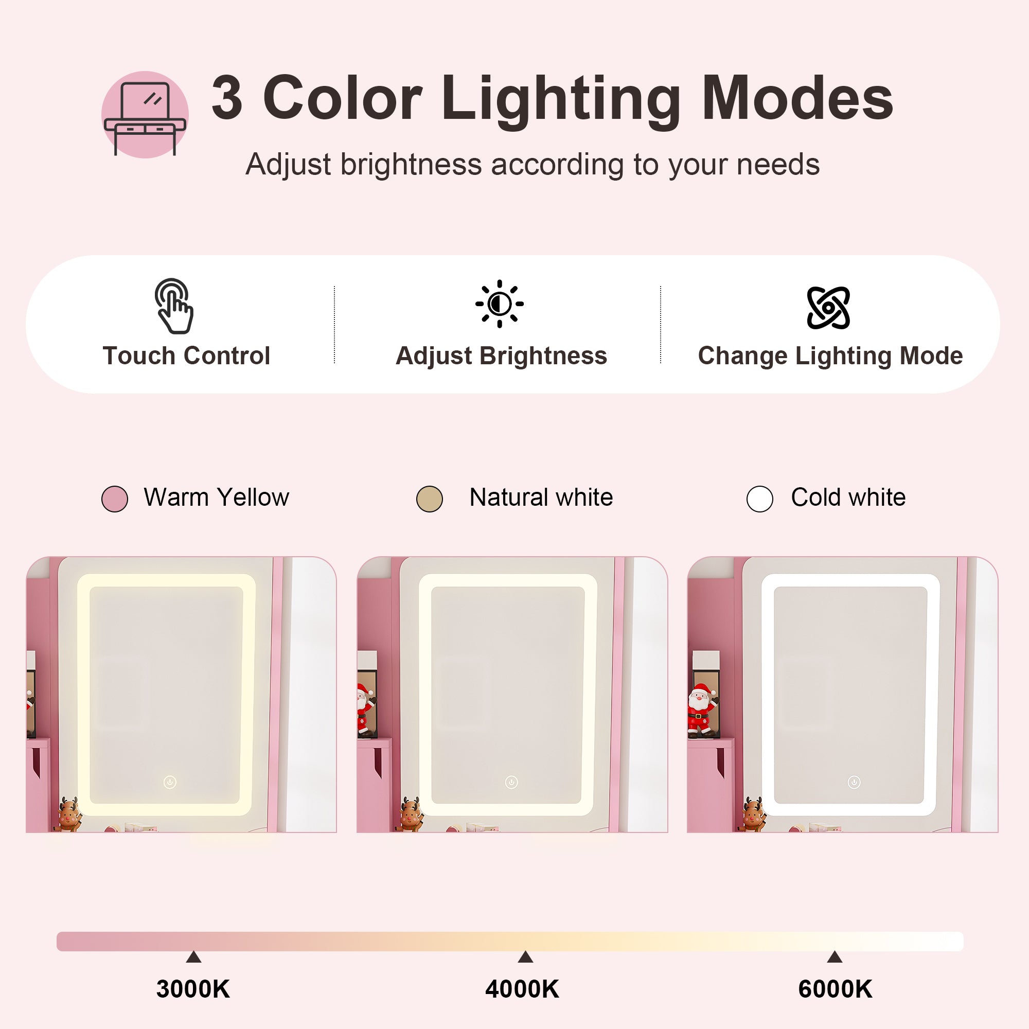 - 【Professional Dimmable LED Mirror】Achieve flawless makeup application with the built-in LED mirror offering 3 professional lighting modes. Simply tap to switch between color temperatures for different settings, or hold to adjust the brightness to your preference—ensuring you always have the perfect light for any occasion.