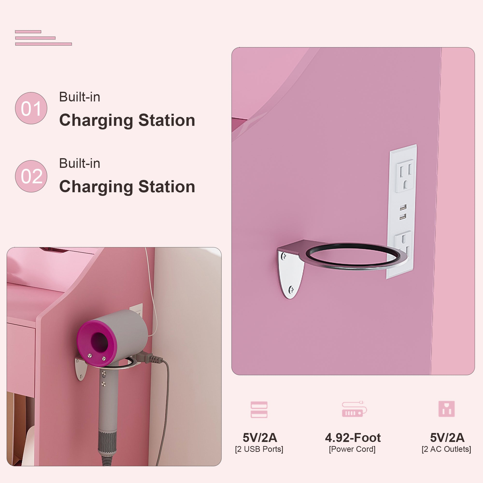 - 【Built-In Charging Station & Hair Dryer Holder】Stay connected and clutter-free with a integrated power hub featuring 2 AC outlets and 2 USB ports. Conveniently charge your devices while you get ready. The added hair dryer holder keeps your tools organized, streamlining your entire beauty routine in one sleek, efficient setup.