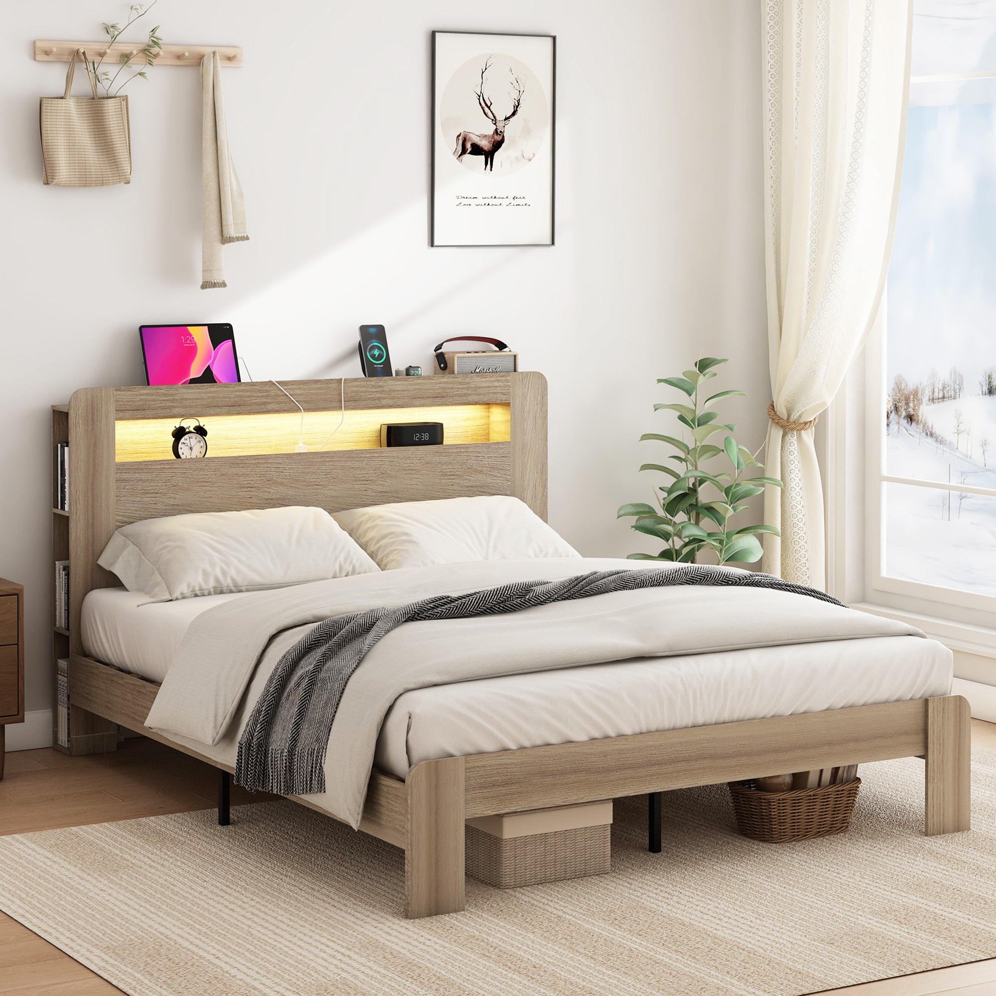 Queen Size Bed Frame with LED Headboard, USB & Storage | Dark Gray Wood Platform