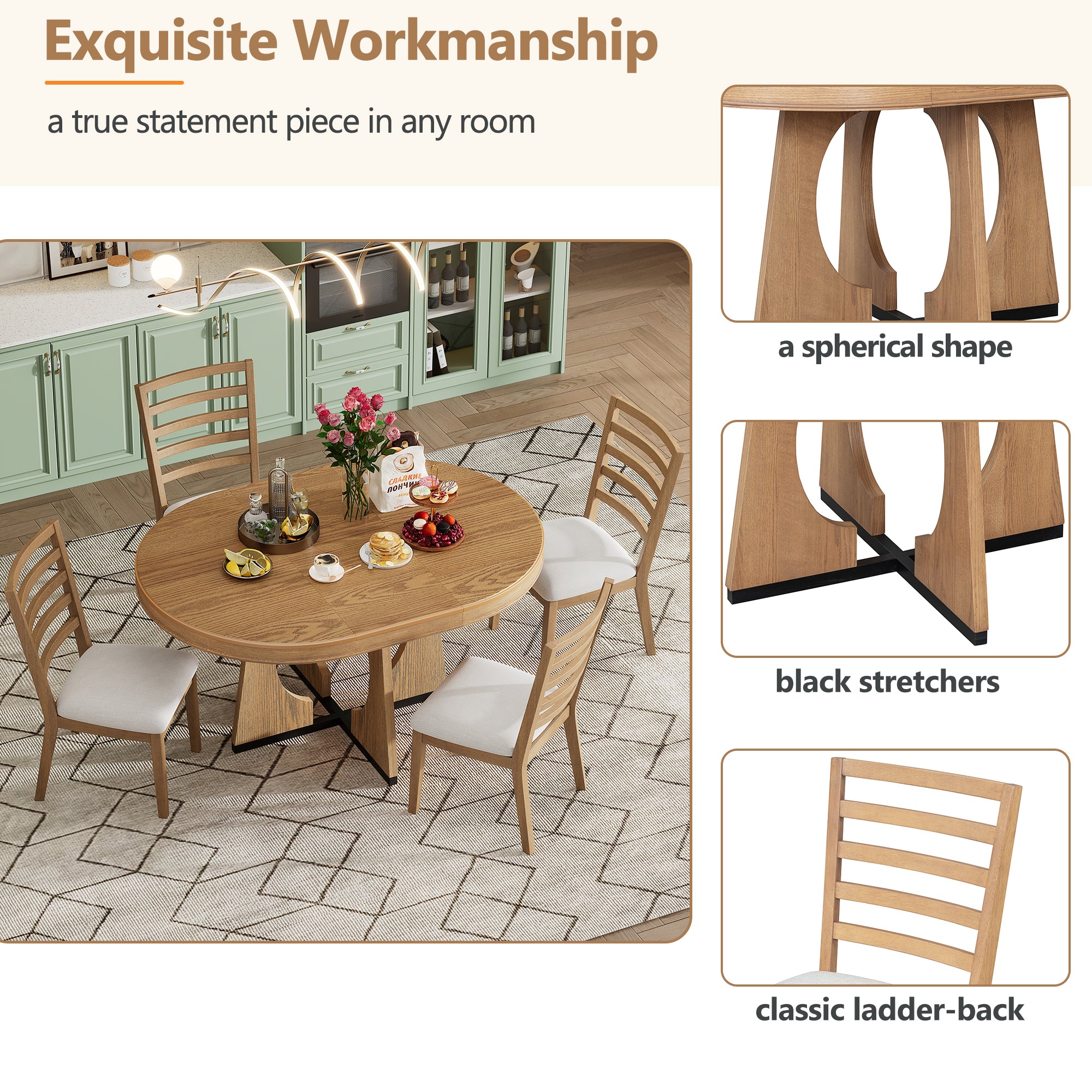 TREXM 5-Piece Retro Rustic Functional Dining Set – 1 Extendable Table with 16-Inch Leaf and 4 Upholstered Chairs, Unique Geometric Design, Ideal for Dining Room and Kitchen (Natural)
